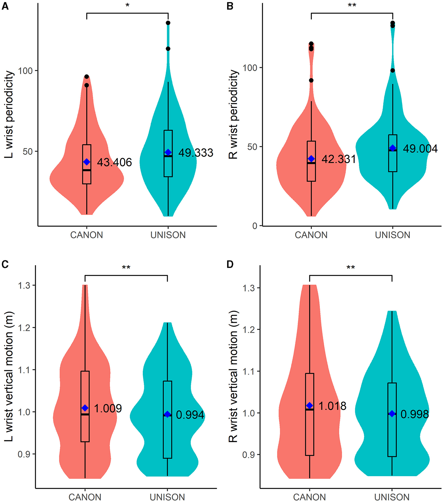 Furthermore, we hypothesized that task demands (i.e., singing the same tune in unison or canon) affect body motion (H3), based on studies suggesting the effects of task demands on interpersonal synchronization and body motion during ensemble performances (Zamm et al., 2015; Palmer et al., 2019). Specifically, we hypothesized that, when singing in canon, singers display higher quantity of body motion (in line with an overall increase of energy in the performance, H3.1), stand closer to the music stand (to follow better the score during the most challenging task, H3.2) and exhibit lower periodicity in wrist movements [based on disruptive aspects of the auditory feedback (Pfordresher and Palmer, 2006), H3.3]. In addition, we were also interested in analyzing the relationship between tuning and singers' wrist motion. In line with previous studies on singers' hand gestures (Brunkan, 2015; Brunkan and Bowers, 2021), we hypothesized that the vertical displacement of the wrists is positively correlated with intonation (H4), as singers would use the wrists' vertical motion to support tuning of higher notes, which is anecdotally reported as being more difficult than for the lower notes.