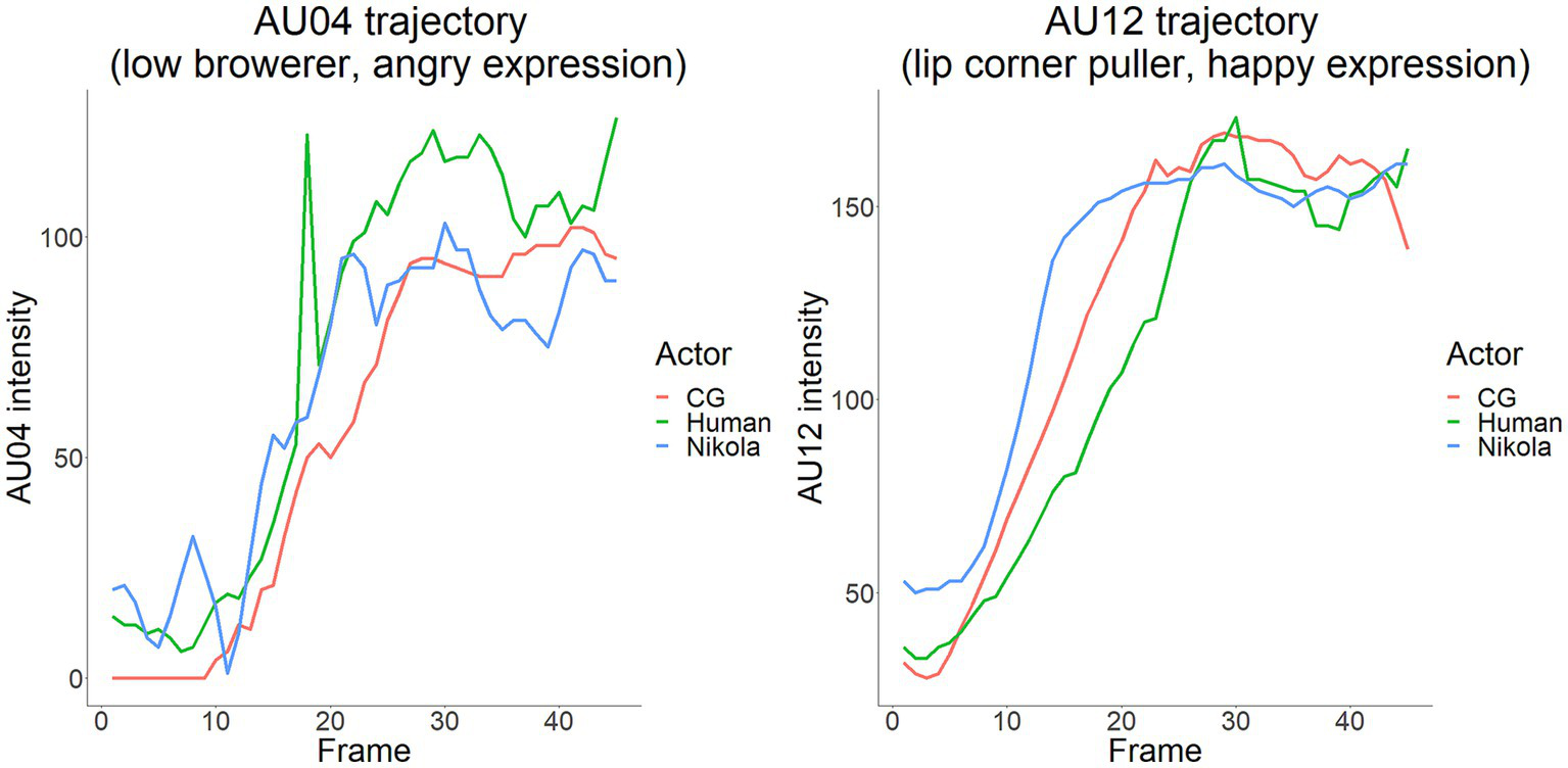 Specifically, AU4 (brow lowerer) and AU12 (lip corner puller) values were used to indicate angry and happy expressions, respectively. The trajectories of both AUs are depicted in Figure 2. While Nikola’s AU12 trajectories began to increase earlier than the other actors, there were no strong deviations in AU intensity between the three actors, indicating that the intensity of AU expressions is analogous across actors.