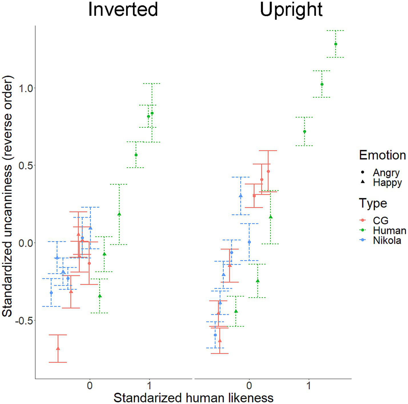 Average uncanniness ratings for each stimulus along the human likeness axis, divided by orientation. Color and point shape indicate agent and emotion type. Error bars indicate standard errors. CG = computer-generated face created via FACSGen.