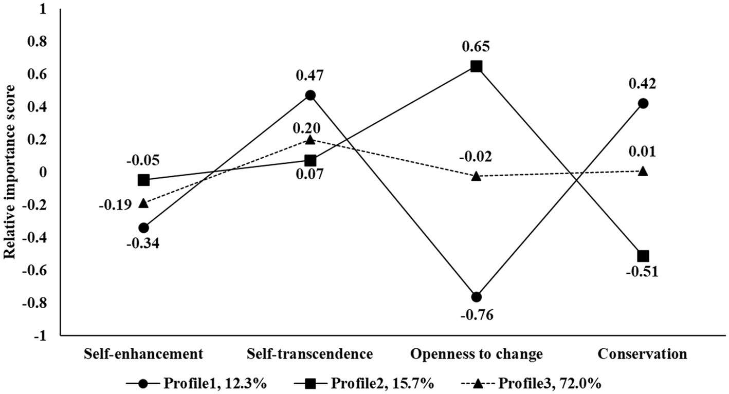 Figure 2 displays the latent profile sizes and relative importance score for the three-profile model of personal values. There were significant differences among the three profiles in the priority dimensions of in the priorities of self-enhancement values (F(2, 607) = 8.46, pcorr < 0.001, η2p = 0.03, profile 1 < profile 3 < profile 2), self-transcendence values (F(2, 607) = 32.51, pcorr < 0.001, η2p = 0.10, profile 1 > profile 3 > profile 2), openness to change values (F(2, 607) = 415.12, pcorr < 0.001, η2p = 0.58, profile 1 > profile 3 > profile 2), and conservation values (F(2, 607) = 468.46, pcorr < 0.001, η2p = 0.61, profile 1 < profile 3 < profile 2).