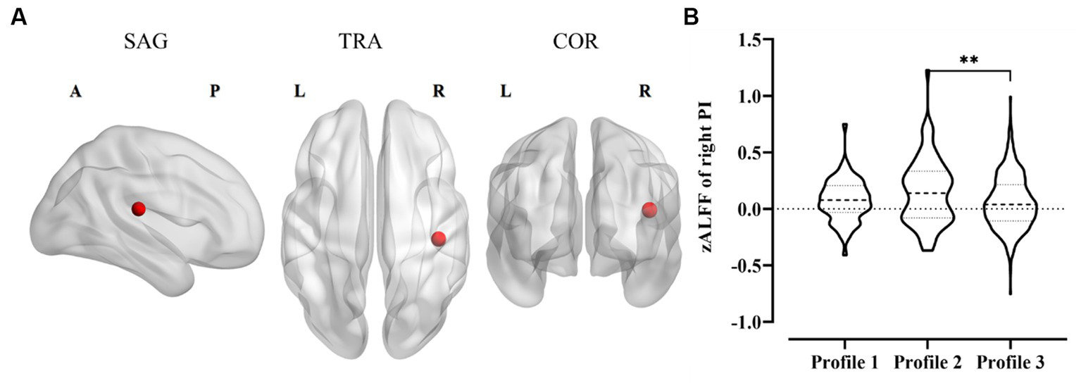 zALFF differences among personal value profiles. (A) zALFF difference in the right posterior insula (Montreal Neurological Institute (MNI) coordinates of red dot: x = 42, y = 24, z = 17) among personal value profiles. SAG, sagittal view; COR, coronal view; TRA, transversal view; A, anterior; P, posterior; L, left hemisphere; R, right hemisphere. (B) Multiple comparisons of zALFF differences in the right posterior insula among three personal value profiles. Violin plots show means (thick dotted line), standard deviation (fine dotted line), and distributions of parameter values. PI, posterior insula, **pcorr < 0.01.