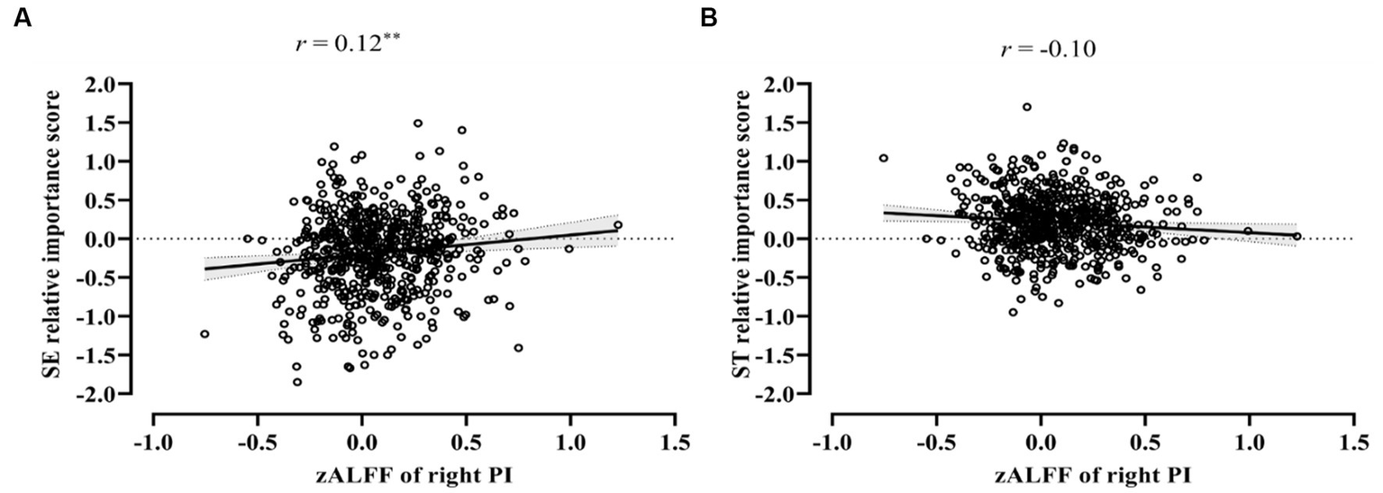 Correlation of value dimensions and zAFLL in the right posterior insula. (A) The significant positive correlation between self-enhancement values and zALFF in the right posterior insula. (B) The insignificant correlation between self-transcendence values and zALFF in the right posterior insula. ST, self-transcendence; SE, self-enhancement; PI, posterior insula. The solid black line is the best-fitting regression line, Error band represents 95% CI, **pcorr < 0.01.