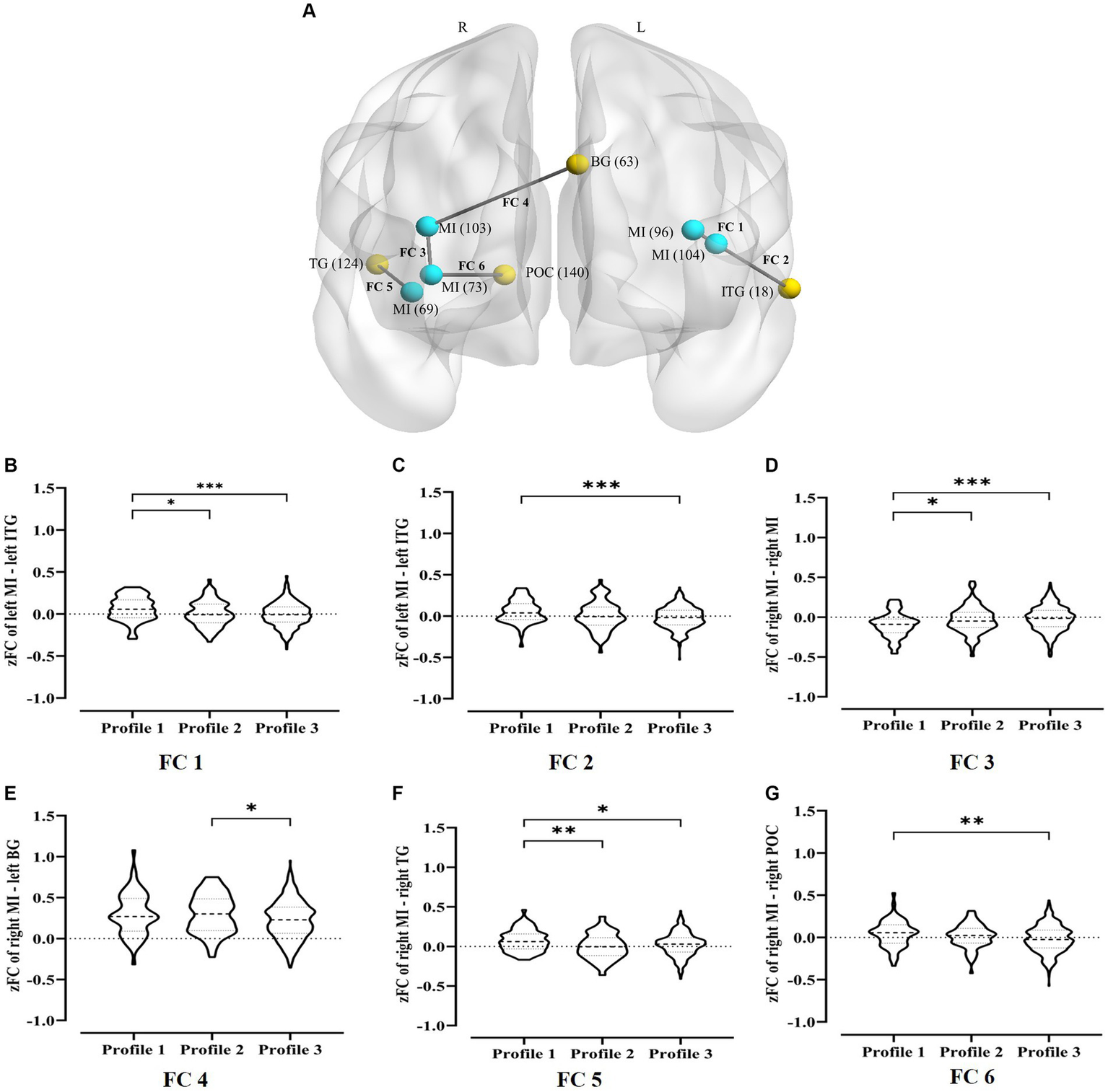 FC intensity differences between personal value profiles. (A) Six insula-based FC with significant intensity differences among three personal value profiles. Labels for cortical regions defined in the Dosenbach Atlas template are in parentheses; the blue dots are ROI 1 and the yellow dots are ROI 2; L, left hemisphere; R, right hemisphere. (B–G) Multiple comparisons of FC intensity between the left middle insula and left inferior temporal gyrus (B,C), within the right middle insula (D), between the right middle insula and left basal ganglia (E), between the right middle insula and right temporal gyrus (F), and between the right middle insula and right posterior occipital cortex (G) among three personal value profiles. MI, middle insula; ITG, inferior temporal gyrus; BG, basal ganglia; TG, temporal gyrus; POG, posterior occipital cortex. *pcorr < 0.05, **pcorr < 0.01, and ***pcorr < 0.001. More details of these FC intensities are described in Table 2.