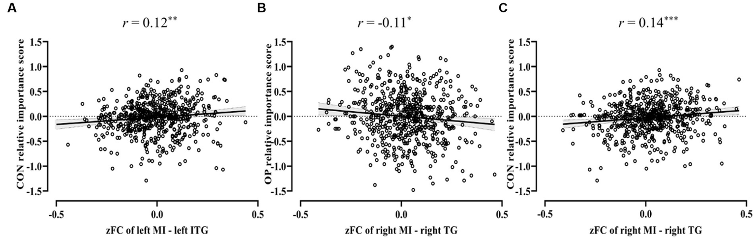 Correlation of value dimensions and insula-based FC intensity. (A) The significant positive correlation between conservation values and the FC of left middle insula – left inferior temporal gyrus. (B) The significant negative correlation between openness to change values and the FC of right middle insula – right temporal gyrus. (C) The significant positive correlation between conservation values and the FC of right middle insula – right temporal gyrus. MI, middle insula; ITG, inferior temporal gyrus; TG, temporal gyrus. The solid black line is the best-fitting regression line. Error band represents 95% CI. *pcorr < 0.05, **pcorr < 0.01, and ***pcorr < 0.001.