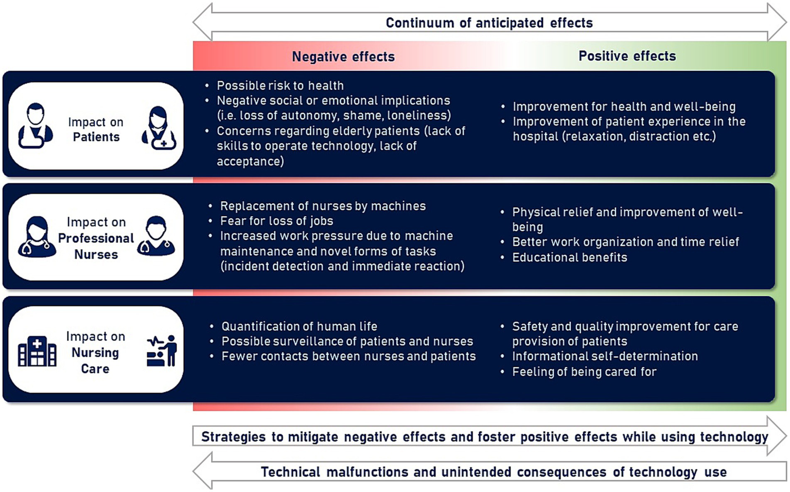 Study participants anticipate different outcomes for the implementation of new nursing technology: (1) For patients, they consider the potential for improvement in health and well-being as well as for their hospital stay experience, but also fear possible health risks or social or emotional factors like loss of autonomy or loneliness. (2) For professional nurses, participants expect relief from physically stressful work routines; however, they might be replaced by machines and lose their employment (3) For the nursing process, safety and quality improvements for care delivery may encounter a negative quantification of human life and risks of constant surveillance.