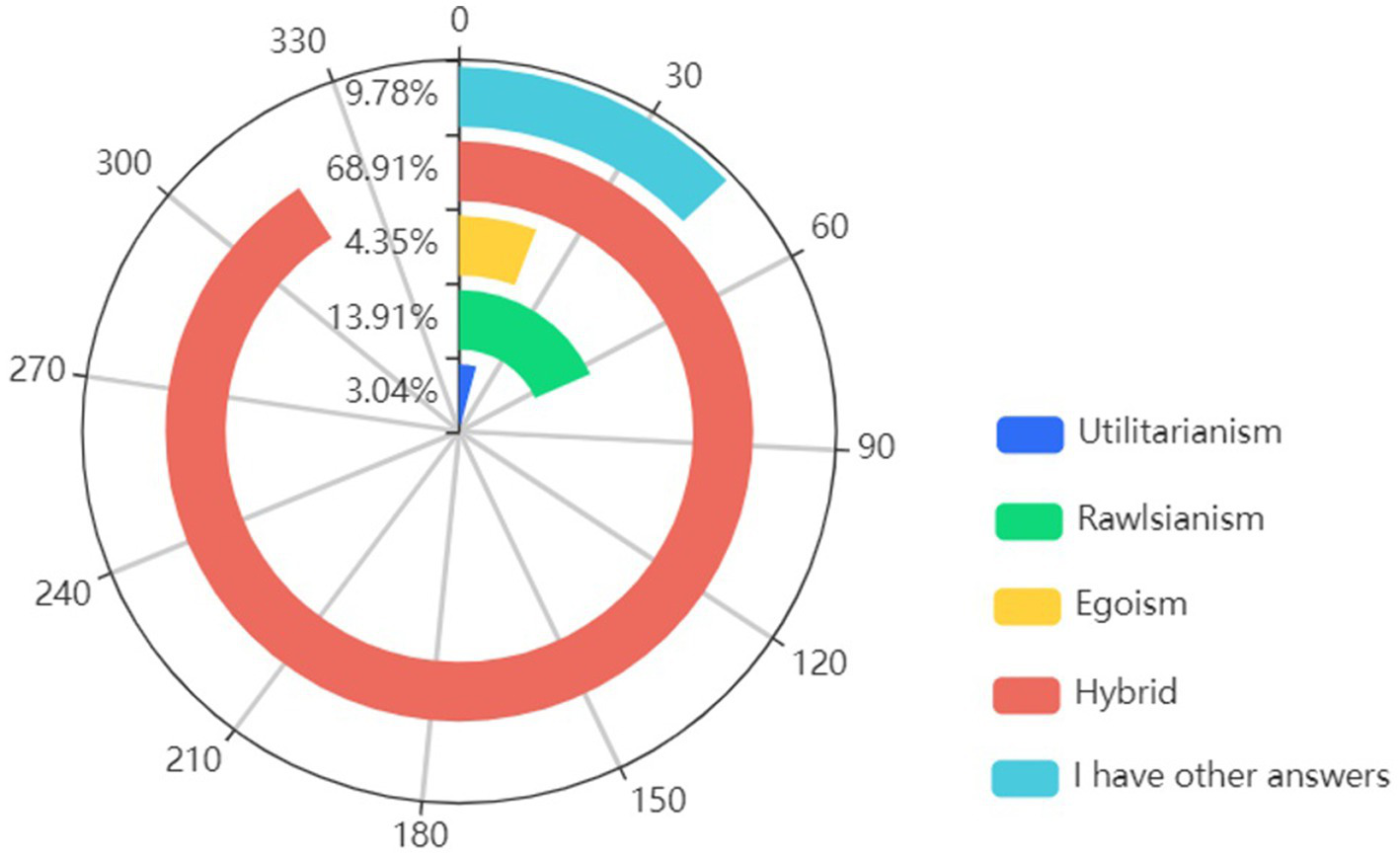 It is clear that Utilitarianism, Egoism, and Rawlsianism all faced their share of theoretical criticism, yet there has been no survey to directly compare their level of moral acceptance as well as preference of purchase, which is important in the previous research for discussing efficiency of moral algorithm. And it is worth noting that the moral acceptance of these algorithms, evidenced by theoretical agreement, may not seamlessly translate into consumer behavior (Bonnefon et al., 2016; Sui and Guo, 2020).