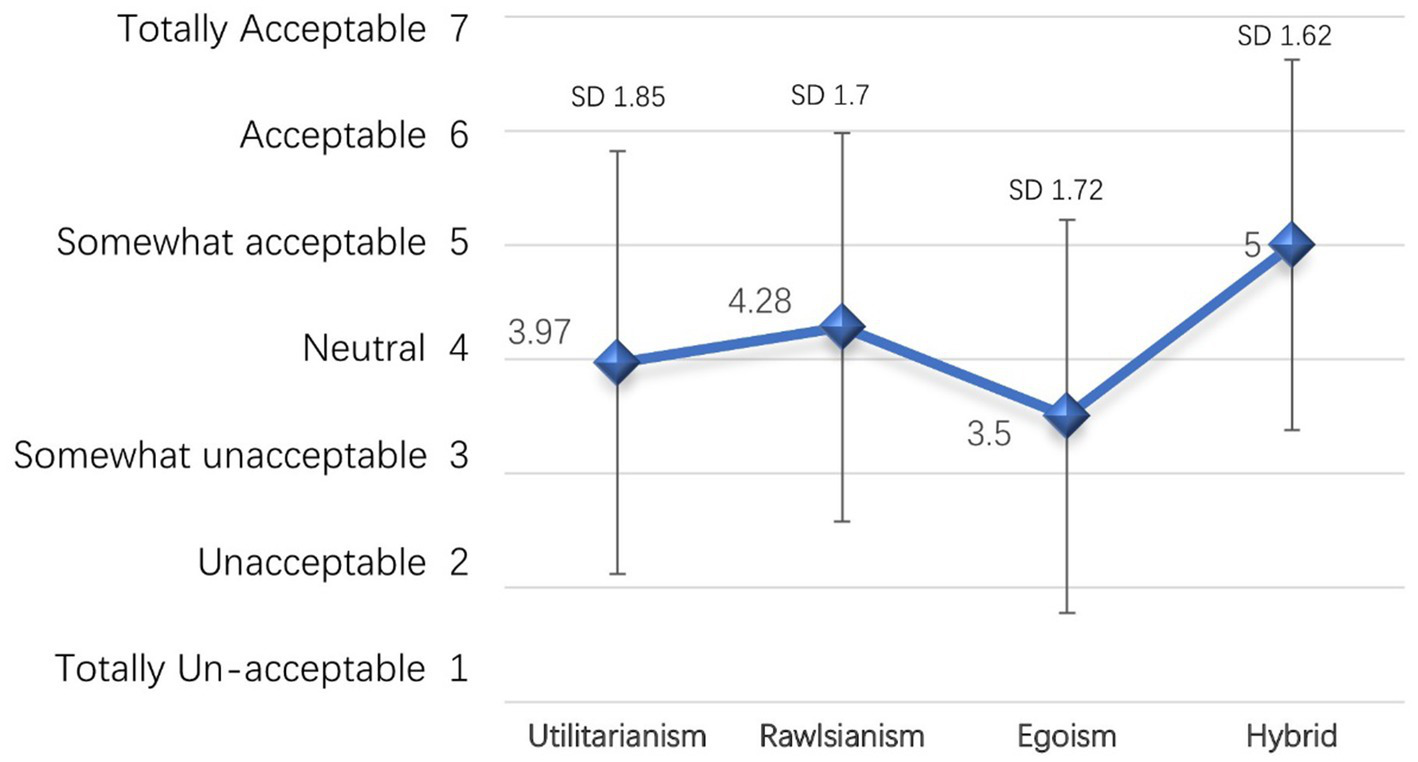 Among them, the Egoism received the lowest mean score of 3.5, with a SD of 1.72. This indicates that participants thought the Egoism approach to be the least morally acceptable among the presented scenarios (see Figure 3).