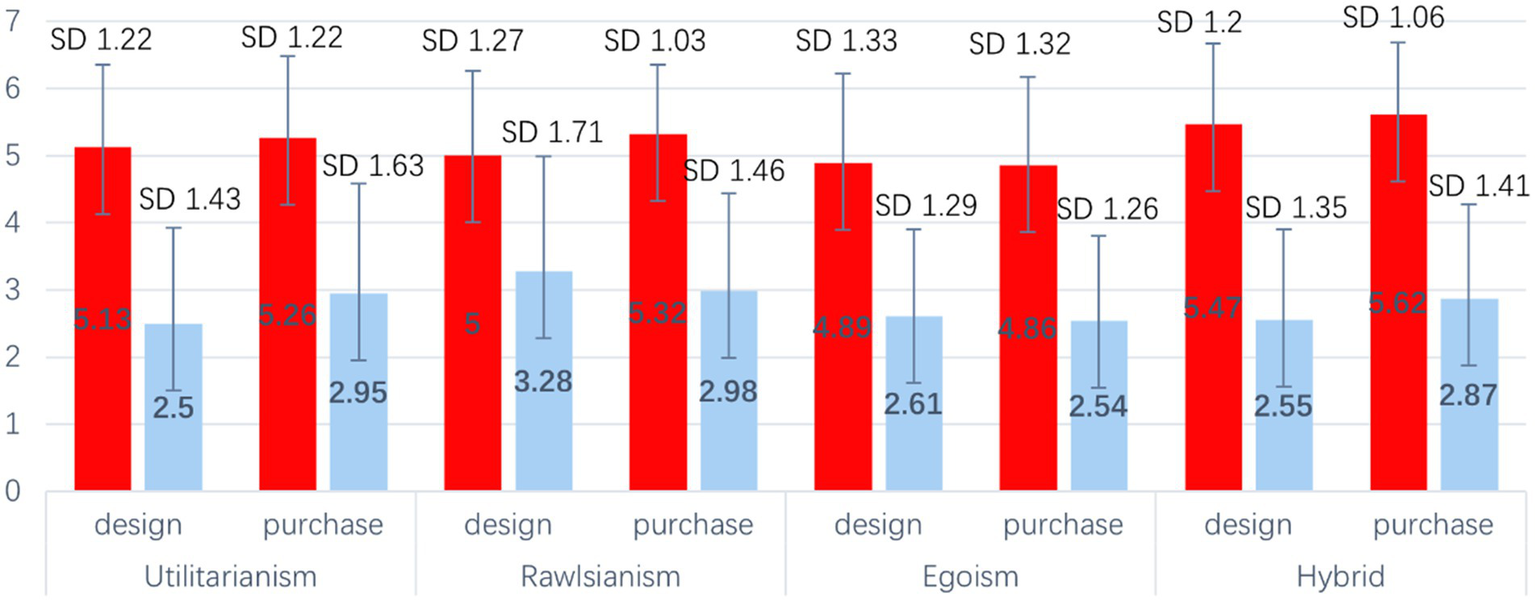 We performed a series of one-way analysis of variance (ANOVA) tests to assess the influence of two independent factors: “design” and “purchase,” on the levels of moral acceptance associated with four distinct moral algorithms. These ANOVA analyses were conducted separately for each independent factor. We found a consistent pattern where individuals who chose to design a moral algorithm within a particular scenario demonstrated higher moral acceptability toward that specific moral algorithm. The same pattern emerged in relation to the scenario of purchase.