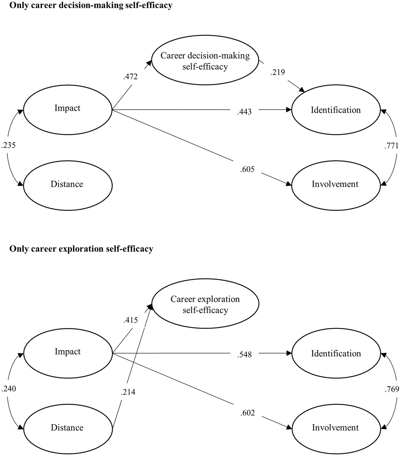 The alternative models with only one mediator each are displayed in Figure 3. The model with only career decision-making self-efficacy presented excellent fit indices, χ2 = 402.1, df = 244, p < 0.001, RMSEA [90% C.I.] = 0.055 [0.046; 0.063], CFI = 0.936, TLI = 0.927, SRMR = 0.069. The regression coefficients were very close to those found in the model with multiple mediators. The model with only career exploration self-efficacy also exhibited good fit, χ2 = 235.2, df = 162, p < 0.001, RMSEA [90% C.I.] = 0.046 [0.034; 0.057], CFI = 0.958, TLI = 0.951, SRMR = 0.063. Like in the model with multiple mediators, career exploration self-efficacy did not impact on any LP dimension. In addition, compared to the model with multiple indicators, the associations between impact and identification were higher. This might be related to the removal of career decision-making self-efficacy from the model, endorsing its mediating effect on the relationship between impact and identification. Therefore, the alternative models corroborate the findings of the model with multiple mediators, meaning that the multicollinearity did not significantly affect the analyses (Figure 3).