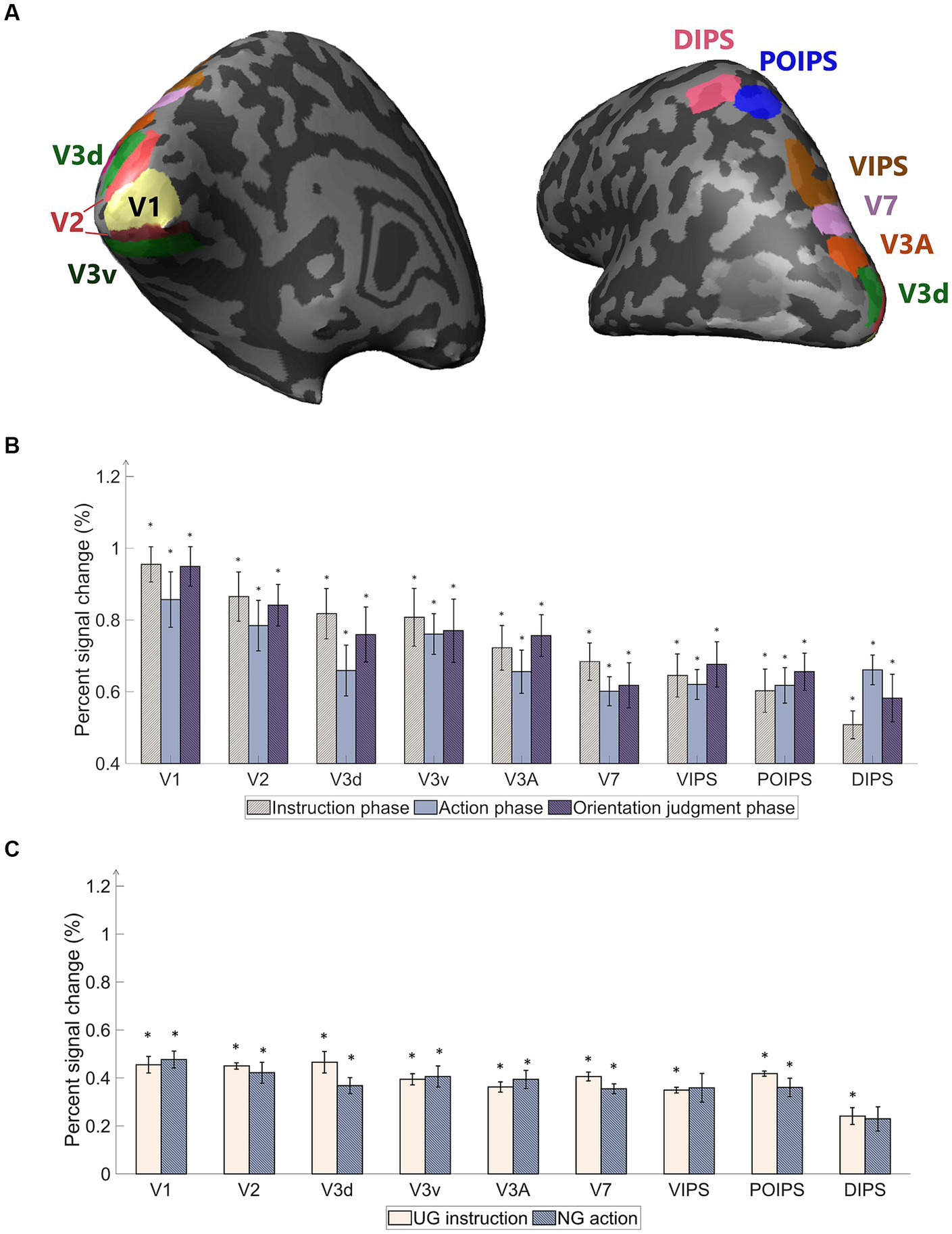 Regions of interest (ROI) used in the experiment and percentage of signal changes in the studied areas. (A) The ROIs contain areas in visual cortices. Our study’s early visual cortex (EVC) includes the areas V1, V2, V3d, and V3v. The dorsal areas include V3A and V7. The intraparietal sulcus (IPS) areas comprise the ventral intraparietal sulcus (VIPS), parieto-occipital intraparietal sulcus (POIPS), and dorsal intraparietal sulcus (DIPS). The dark gray pattern indicates the sulci, whereas the light gray pattern indicates the gyri. The ROIs were individually delineated by standard localization sessions (see the fMRI acquisition section). (B) Percent signal changes of the areas using averaged BOLD data from instruction, action, and orientation judgment phases. The signal changes decrease toward the higher-order areas. (C) Percent signal changes of the areas using averaged BOLD data from UG condition in the instruction phase and NG condition in the action phase. Compared to (B) results, the signal changes had the same decreasing tendency toward higher-order areas but lower overall signal strength. The error bars represent the standard error of the mean from all participants (n = 10). The asterisk represents the percent signal changes significantly above the 0 from the t-test in group data (*p < 0.0005).
