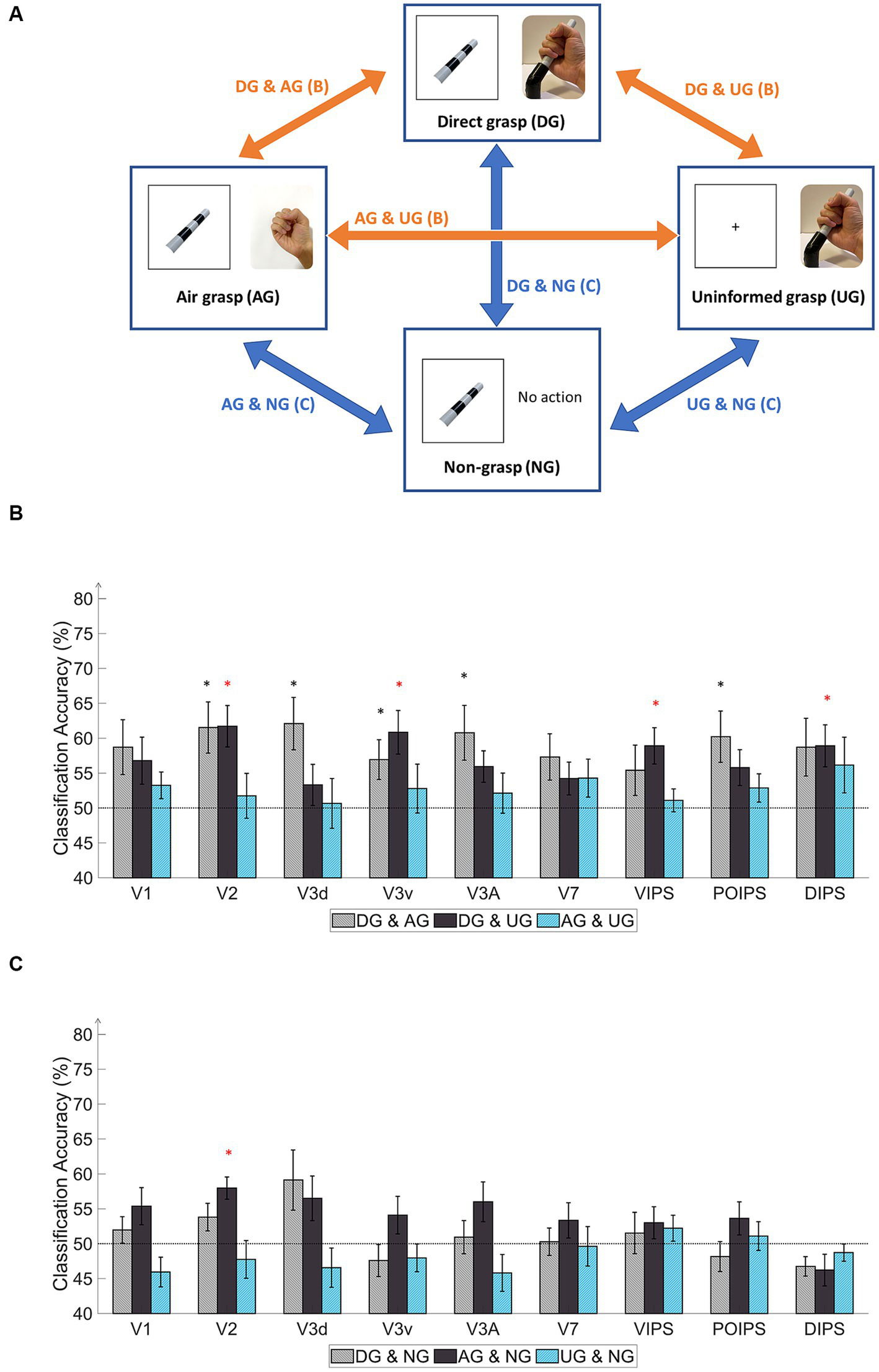Schematics and results of ROI-based MVPA “transfer-type” orientation classification schematics in the action phase. (A) The schematic indicates transfer-type orientation classifications. The transfer-type orientation classification is displayed by arrows pointing to the pair of conditions to transfer as follows: DG & AG, DG & UG, AG & UG, AG & NG, DG & NG, and UN & NG. (B) The bar graph indicates the decoding results from the MVPA classification in the transfer-type classification of the DG & AG, DG & UG, and AG & UG. The areas V2, V3v, VIPS, and DIPS showed significantly high classification accuracy in “DG & UG.” (C) The bar graph displays decoding results from the transfer-type classification of AG & NG, DG & NG, and UN & NG. Only V2 showed significantly high decoding accuracy in “AG & NG.” In every graph, the dashed line indicates the chance level of the classification at 50%. The error bars represent the standard error of the mean across the participants (n = 10). The black asterisk represents the statistical significance over the chance level (50%) or between the grasping types in (2) with two-tailed t-tests across the subjects (p < 0.05). The red asterisk indicates the statistical significance based on an FDR correction of q < 0.05.