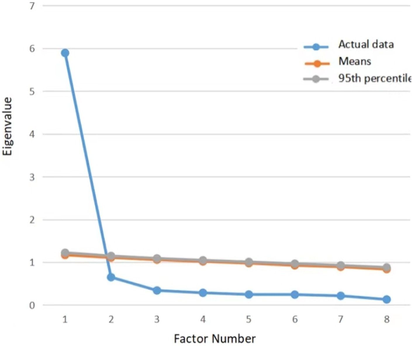 To examine the latent factor structure of the Chinese version of the Trait Gratitude to Nature Scale (TGNS), exploratory factor analysis (EFA) was conducted in Sample 1 according to established guidelines. Two specific criteria were considered: (1) the Kaiser-Mayer-Olkin (KMO) test value should exceed 0.70, and (2) the significance of Bartlett’s sphericity test should be below the threshold of p < 0.001 (Montoya and Edwards, 2021). In addition, we employed parallel analysis to identify the relevant factors. Parallel analysis is considered more stringent in determining the number of factors to extract from the analysis. It recommends retaining factors with eigenvalues higher than the randomly generated eigenvalues of their corresponding components in a simulated dataset, which possesses an equivalent number of items and respondents (Yazdani and Bonsaksen, 2019).
