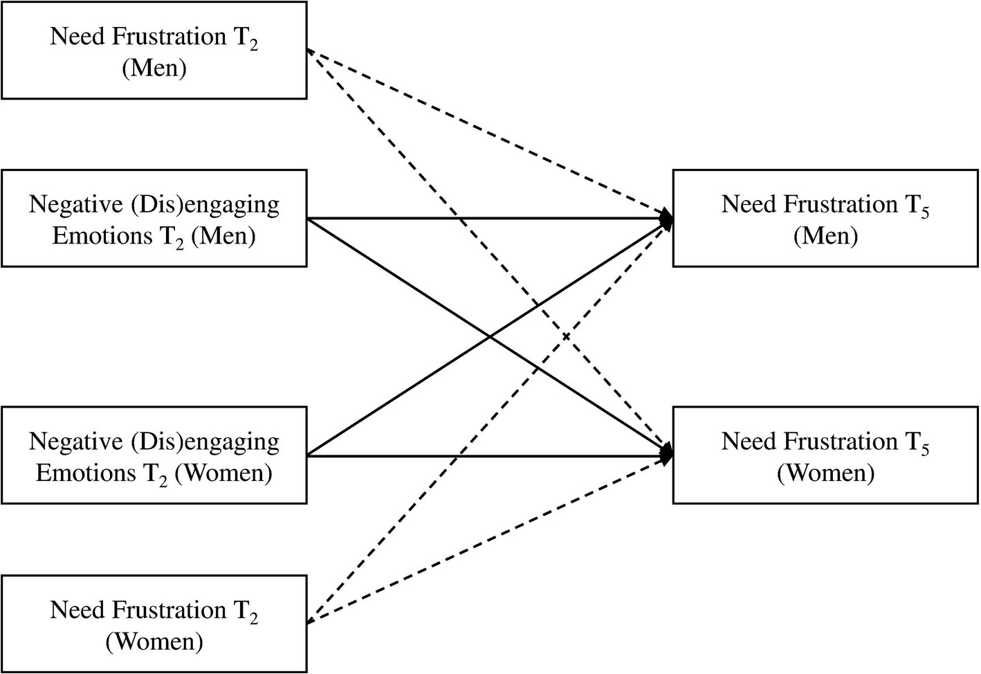 Actor-partner interdependence models used to assess the temporal associations between negative emotions (disengaging, engaging) at T2 and relational need frustration (autonomy, relatedness) at T5. The main paths are in black, while control paths are dashed.