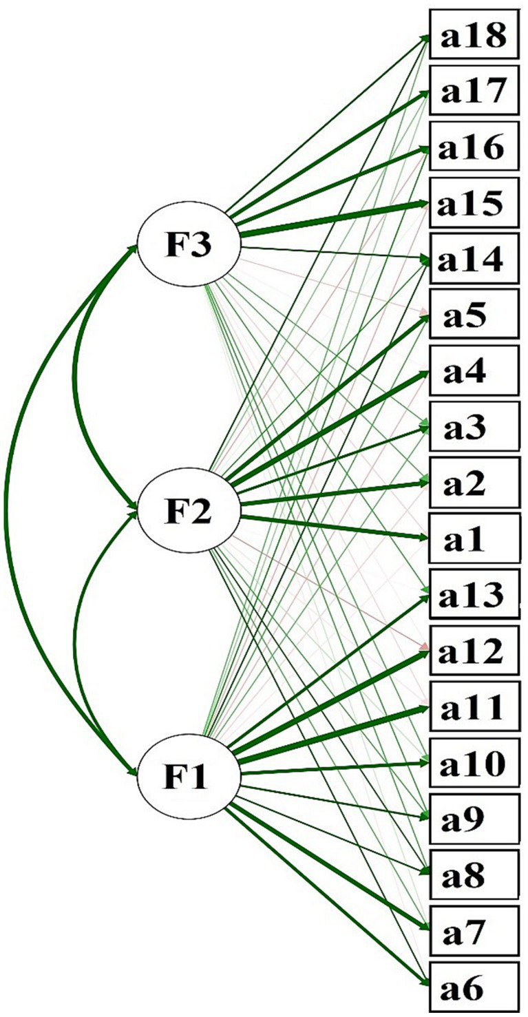After justifying the validity of the content with experts and systematizing all information, we started the statistical analysis. In addition, the skewness and kurtosis coefficients were obtained for each of the items, the results showed that item 2 presented the minimum value of skewness (−0.262), while item 12 presented the maximum value (1.823). Regarding kurtosis, item 3 presents the minimum value (−1.213) and item 12 the maximum value (2.41), which indicates that the values of the latter item are above the recommended value ±1.5 (Pérez and Medrano, 2010). Continuing with the univariate normality analysis, it was also evaluated through the calculation of Z-scores for each item, the results allowed describing that most of the items scored within the expected range of ±3.0 except for items 2, 4, 7, and 13, since the values will be obtained outside the established range (Kapoor, 2016). These results provide additional information to the analysis of skewness and kurtosis, complementing with the verification that the data do not follow a univariate distribution in all cases (all 18 items), putting an early warning to be more careful on these items when evaluating the internal structure by means of the CFA. Furthermore, Mardia’s coefficient criteria were used to obtain multivariate normality values (as an appropriate value G2 ≤ 5.0), which indicated that the data do not follow a multivariate distribution (G2 = 17.852). Therefore, the robust method (WLSMV) was used to obtain the adjustment parameters using the CFA. In addition, because the data are ordinal and do not have a proper multivariate normal distribution, the use of the robust estimator is justified.