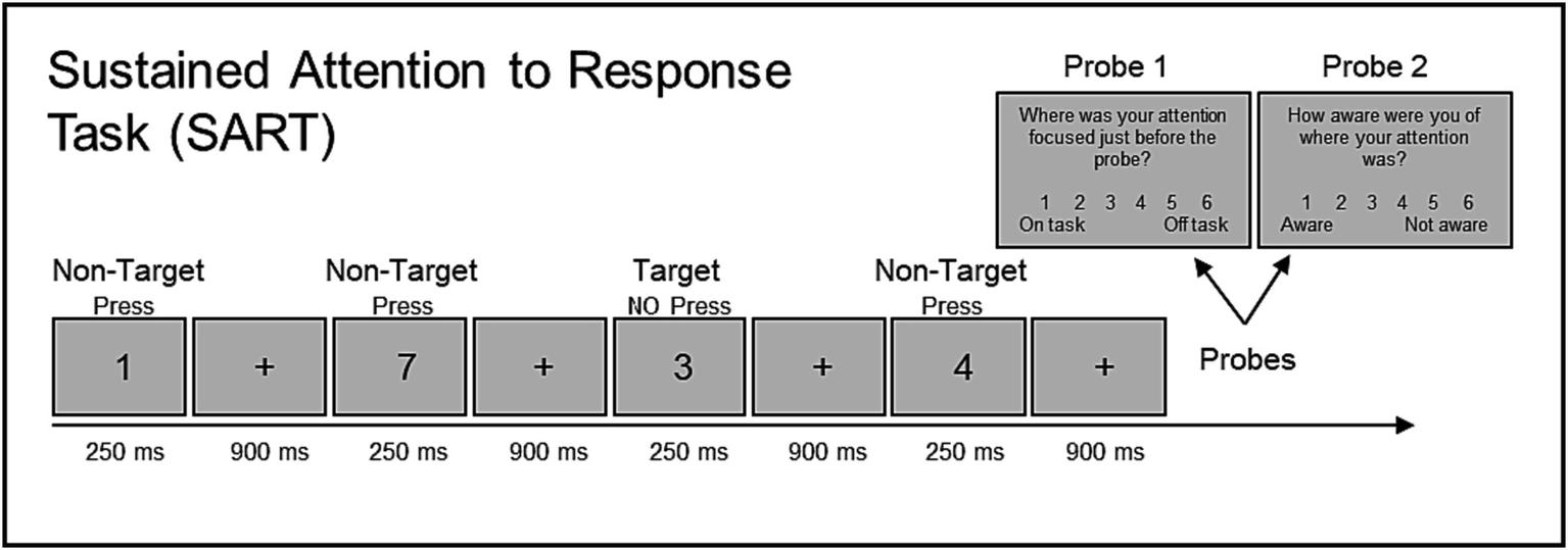 Mind wandering is a pervasive phenomenon characterized by attentional instability wherein off-task thoughts occur during an ongoing task or activity. Herein, we focus on mind wandering during cognitive task performance. One laboratory-based cognitive task during which mind wandering has been readily assessed is the Sustained Attention to Response Task (SART; Robertson et al., 1997). During this task, self-reported mind wandering is assessed via embedded experience sampling probe questions that aim to capture mind wandering in the moment. Prior research has reliably linked greater subjective mind wandering with poorer task accuracy (e.g., Randall et al., 2014; Kane et al., 2016) and greater response time variability (Zanesco et al., 2020). Beyond laboratory settings, the occurrence of mind wandering has been associated with errors in everyday activities (Baldwin et al., 2017) and may be particularly consequential in applied workplace settings (Li, 2022). Given these detrimental effects, there has been growing interest in effective methods to promote greater attentional control over mind wandering.