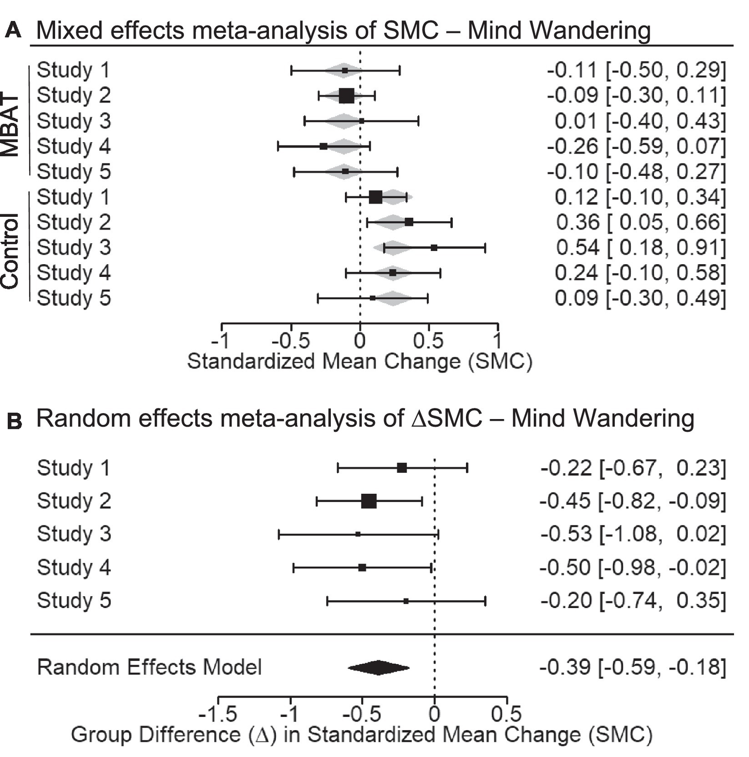 (A) Depicts the multivariate mixed effects meta-analysis of standardized mean change (SMC) from T1 to T2 in probe-caught mind wandering scores for MBAT and control conditions. Negative SMCs indicate that individuals mind wander less frequently from T1 to T2 with meta-analytic effect sizes and 95% confidence intervals shown as black boxes and error bars. (B) Depicts the difference in standardized mean change between MBAT and control groups (∆SMC) in probe-caught mind wandering scores. A negative ∆SMC indicates greater decreases in mind wandering scores from T1 to T2 in MBAT groups relative to control groups. Based on the random effects model, the overall meta-analytic effect size and 95% confidence interval is provided below the individual study estimates.