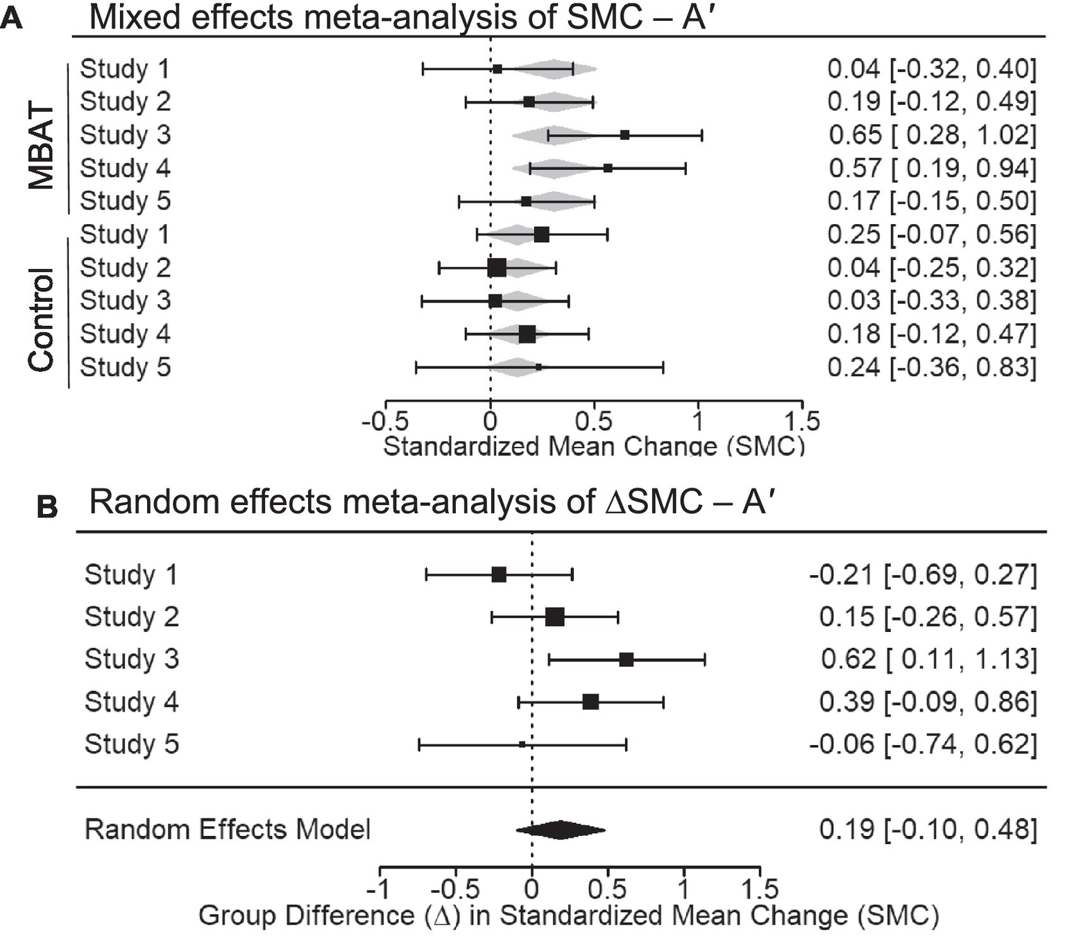 (A) Depicts the multivariate mixed effects meta-analysis of standardized mean change (SMC) from T1 to T2 in probe-caught meta-awareness scores for MBAT and control conditions. Negative SMCs indicate that individuals are more aware from T1 to T2 with meta-analytic effect sizes and 95% confidence intervals shown as black boxes and error bars. (B) Depicts the difference in standardized mean change between MBAT and control groups (∆SMC) in meta-awareness scores. A negative ∆SMC indicates greater increases in awareness from T1 to T2 in MBAT groups relative to control groups. Based on the random effects model, the overall meta-analytic effect size and 95% confidence interval is provided below the individual study estimates.