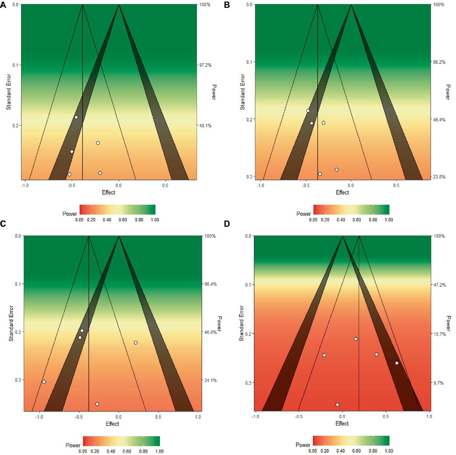 Funnel plots of the group difference in standard mean change (∆SMC) for (A) mind wandering, (B) meta-awareness, (C) ICV, and (D)A′. ∆SMCs for each study are depicted as white dots and are plotted by the standard error from each respective study. The color gradient represents the overall statistical power of the meta-analytic effect from red (low power) to green (high power). The vertical line that bisects the triangle depicts the meta-analytic effect size for each of the outcomes. Estimates in the shaded region fall within the 5 to 1% significance level from zero.