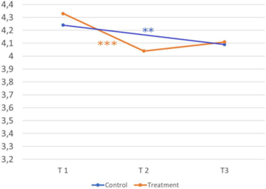 The analyses reported here are based on a sample of n = 1236 students, including the treatment group with n = 766 and the control group with n = 470 students. The treatment sample includes only cases that participated in the workshop at all three measurements of T1, T2, and T3 and allowed 100% agreement in the assignment of the survey time points. For the control group, data are available at measurement time points T1 and T3. The assignment could be performed anonymously using an especially for this purpose elaborated code (Schratz, 2020). According to the German school system, there is a division of students into school types with different grades. Most of them are represented in the sample. Upper secondary school leading to university entrance (Gymnasium) 41%, junior high school leading to the intermediate school certificate (Realschule) 38%, and secondary schools offering basic secondary education (19.5% Hauptschule & 2.5% Gesamtschule). In the treatment group, 13.2% of students are in grade 8, 54.8% are in grade 9, 24.1% are in grade 10, and 8% of students are in grades 11 and 12. In the control group, 9.1% attended the 8th grade level, 67.2% attended the 9th grade level and 10th grade level amounts to 23.6% of students. The gender ratio was roughly balanced, with 48.9% female and 49.8% male adolescents. Just under 1.2% classified themselves as diverse. The data collection took place until the end of the 2022/23 school year.