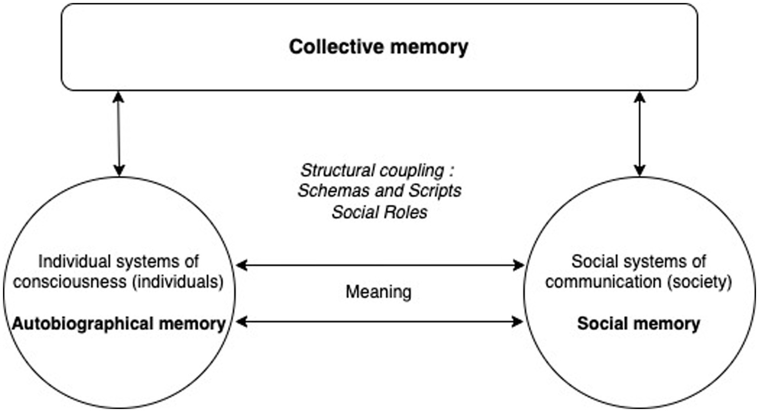 Structural coupling: schemas, scripts, and social roles. At the top of the figure, collective memory appears as an emergent phenomenon, between individual systems of consciousness (individuals) and social systems (society). Collective memory is a specific operation of individual consciousness when it participates in or connects to the communication that constitute society, either as member of social group (shared memory), or as participant in social interaction (collaborative memory). The circle on the left represents individual consciousness: autobiographical memory corresponds to the operations of selection (sorting between forgetting and remembering) of an individual system of consciousness. The circle on the right represents social systems: social memory corresponds to the operations of selection (sorting between forgetting and remembering) of society as a communication system. The double arrow linking the two circles represents the universal medium of all psychic and social systems, meaning: the result of the joint evolution of individuals and society. The semantic component of autobiographical memory is thus directly linked to social memory, to the multiple selections of meaning produced and reproduced by communication operations. In the center of the figure, schemas and scripts, as well as social roles, make possible the structural coupling between consciousness and communication, thanks to the common medium of meaning.