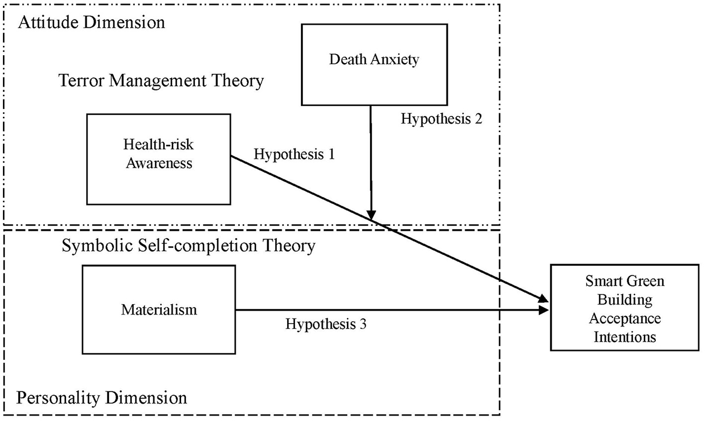 In response to the above problems, this paper introduces terror management theory (Pyszczynski et al., 2015) to explain whether consumers' health risk awareness will affect their willingness to accept smart green buildings when they face the threat of climate change and death, and this relationship is positively moderated by death anxiety. Indeed, past studies have also pointed out that the research on the integration of terror management theory and climate change is not enough, so future research is needed to explore the mechanism of consumer behavior in different scenarios (Dalby, 2017). In addition, materialism is gradually spreading in Asian countries (Das and Jebarajakirthy, 2020), so this paper uses the self-completion theory (Hu et al., 2014) to explain why materialistic consumers have high willing nesses to accept smart green buildings. Based on symbolic self-completion theory (Hu et al., 2014), expensive luxury goods are important symbols of self-completion theory because they can highlight consumers' own success and material value. Compared with traditional non-smart buildings, smart green buildings are high-priced products, which have an effect similar to expensive luxury goods.