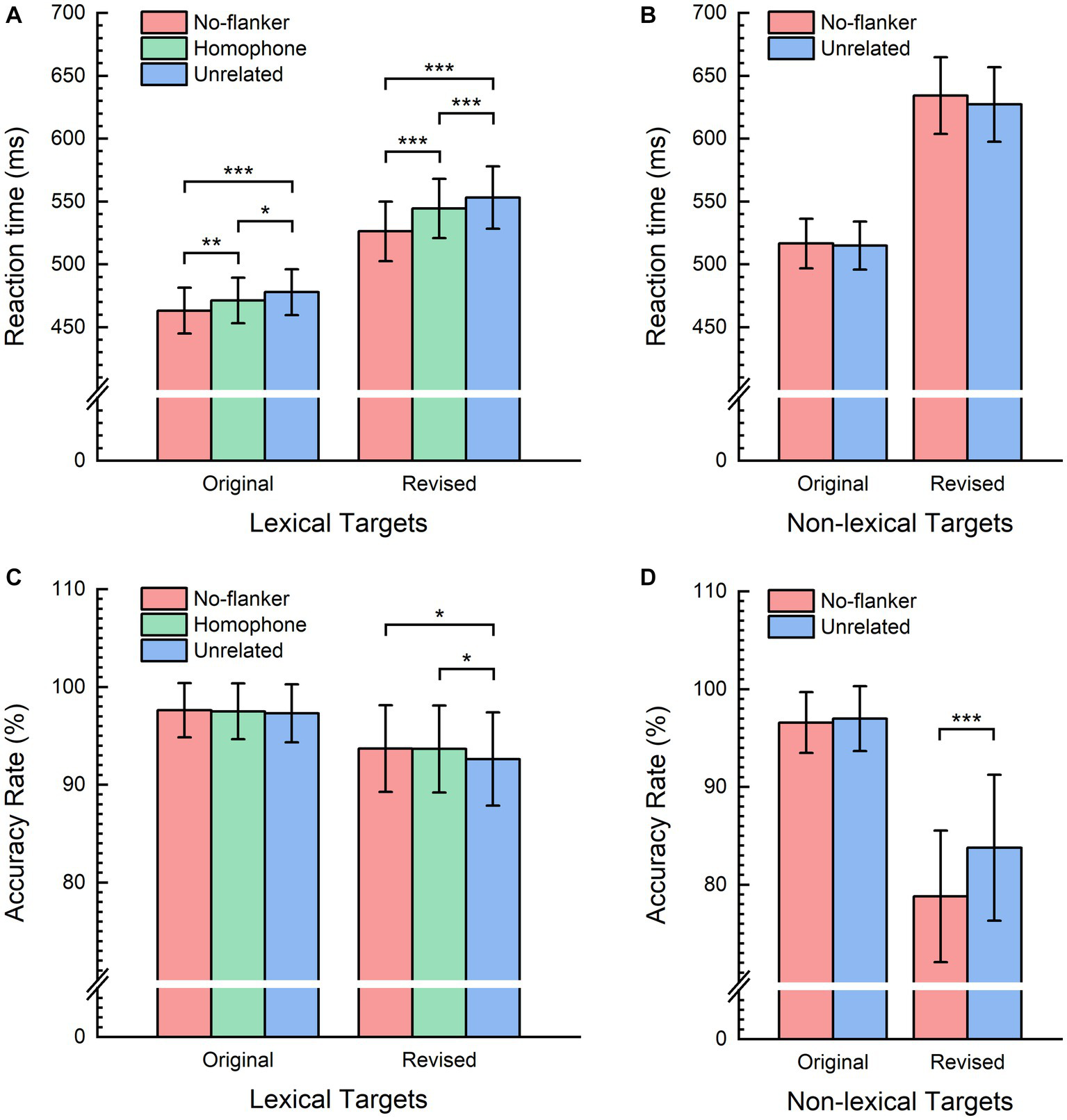 Histograms of the mean reaction times (RTs) and accuracy rates (ARs). (A) Mean RTs for the lexical target characters. (B) Mean RTs for the non-lexical target characters. (C) Mean ARs for the lexical target characters. (D) Mean ARs for the non-lexical target characters. Error bars represent one standard error mean. Asterisks denote two-tailed p-values obtained from bootstrapping: ***p < 0.001; **p < 0.01; *p < 0.05.