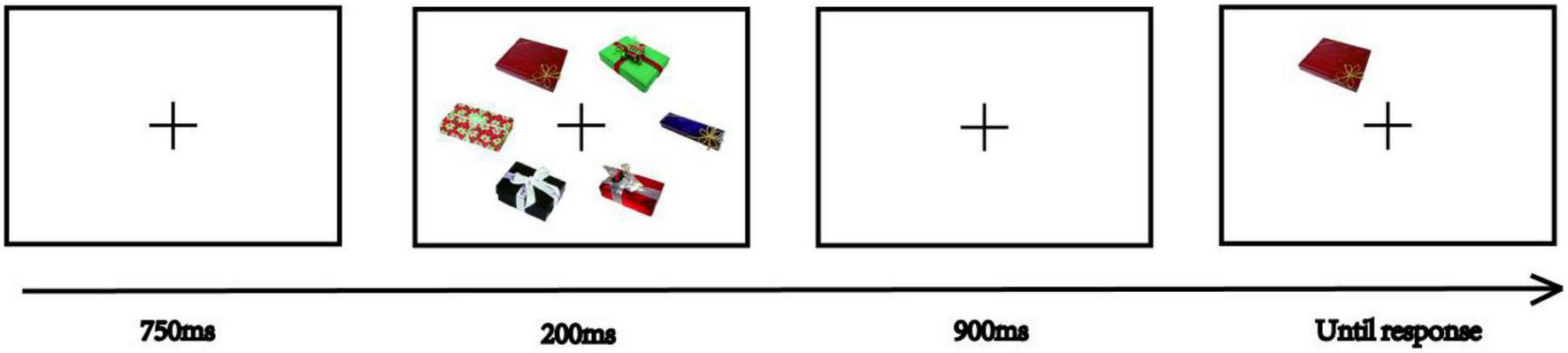 All the participants were required to place their chins on a chin rest during the testing phase. The distance between the participant’s eyes and the center of the screen was 60 cm. All stimuli were presented on a 17-in CRT (refresh rate: 60 Hz; resolution: 1600 × 900). The experiment was carried out in a dimly lit laboratory. Material presentation and response collection were executed via Python scripts.