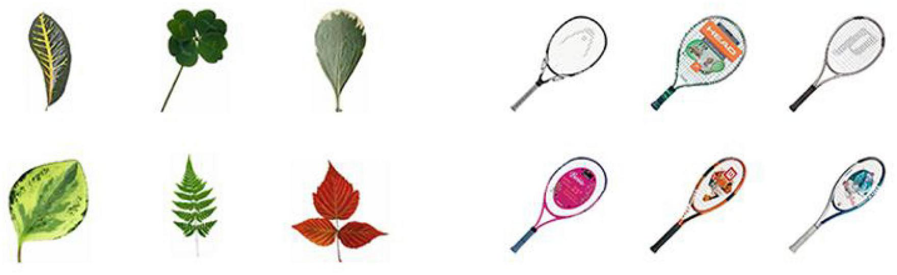 Apparatuses were identical to Experiment 2. A crucial difference was the stimuli. As Figure 7 shows, we selected two pairs of matched categories of real-world objects which contained distinct values in only the perceptual shape dimension as the stimuli in the current experiment and we presented the partial exemplars in Figure 7: trophies (kind dimension scores: 3.2; shape dimension scores: 4.6; color dimension scores: 3.2) matched with cigarettes (kind dimension scores: 3.2; shape dimension scores: 1.4; color dimension scores: 3.0), leaves (kind dimension scores: 2.8; shape dimension scores: 5.0; color dimension scores: 3.3) matched with the tennis racquet (kind dimension scores: 2.7; shape dimension scores: 1.6; color dimension scores: 3.8).