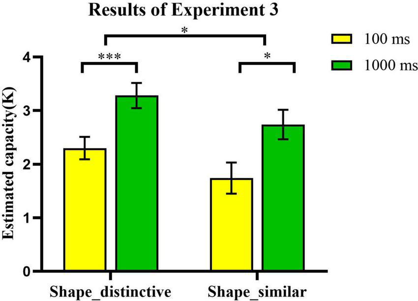 We explored in a straightforward fashion shape information’s effect on VWM storage for different encoding times. As Figure 8 shows, a 2 × 2 (encoding time × type of real-world objects) repeated measures analysis of variance (ANOVA) was constructed. We found a significant main effect of the perception information of shape [F(1, 24) = 7.18, p < 0.013, η2p = 0.23, BF10 = 2.669]. The memory performance in the shape-distinctive condition (Mean: K = 2.79, SEM = 20%) was better than the shape-similar condition (Mean: K = 2.24, SEM = 21%). We also found a significant main effect for encoding time [F(1, 24) = 18.49, p < 0.001, η2p = 0.44, BF10 = 93.940]. The capacity of VWM was higher when the encoding time was 1000 ms (Mean: K = 3.01, SEM = 22%) than 100 ms (Mean: K = 2.02, SEM = 20%). Those results showed that shape information of real-world objects affected our VWM capacity. Capacity increased as the encoding time increased (Brady et al., 2016). There were no interaction effects between encoding time and type of real-world objects in this experiment [F(1, 24) = 0.002, p = 0.961, η2p = 0.00, BF10 = 0.257].