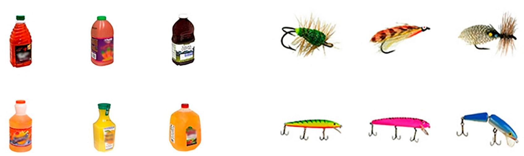 The apparatus was identical to Experiment 1. We followed the operational definition from Konkle et al. (2010) and selected real-world objects according to conceptual distinctiveness rankings from Konkle et al. (2010). In Konkle et al. (2010) research, they specifically targeted the subordinate category structure to definite the concept of conceptual distinctiveness, that is, the number of kinds of a given object category (i.e., the variety of kinds). For example, there are many kinds of juice and only a few kinds of fishhooks just as Figure 9 shows. In Experiments 4 and 5, we controlled the category-distinctive condition and the category-similar condition by using the conceptual distinctiveness rankings results from Konkle et al. (2010). In the present experiment, we selected the objects with category ratings for the category dimension of fewer than 2 points as the alternative stimuli for the category-similar condition, and we selected those with a category rating for the category dimension of more than 4 points as the alternative stimuli of category-distinctive conditions. Finally, three matched pairs of real-world objects were selected in this procedure, bread loaves (kind dimension scores: 4.0; shape dimension scores: 3.5; color dimension scores: 1.9) matched with headphones (kind dimension scores: 1.6; shape dimension scores: 3.1; color dimension scores: 1.7), juice (kind dimension scores: 4.5; shape dimension scores: 4.0; color dimension scores: 4.6) matched with fishhooks (kind dimension scores: 1.6; shape dimension scores: 4.2; color dimension scores: 4.7), soda cans (kind dimension scores: 4.3; scores of the dimension of shape: 1.5; scores of the dimension of color: 4.9) matched with scrunchies (elasticized fabric rings used to style hair) (kind dimension scores: 1.1; shape dimension scores: 1.5; color dimension scores: 4.8).