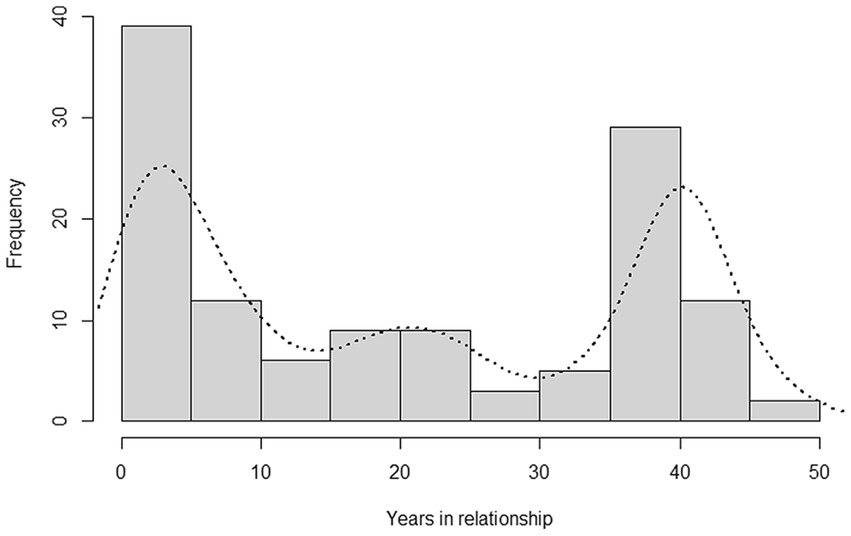 Length of relationship histogram [n = 126 (persons; 56%)].