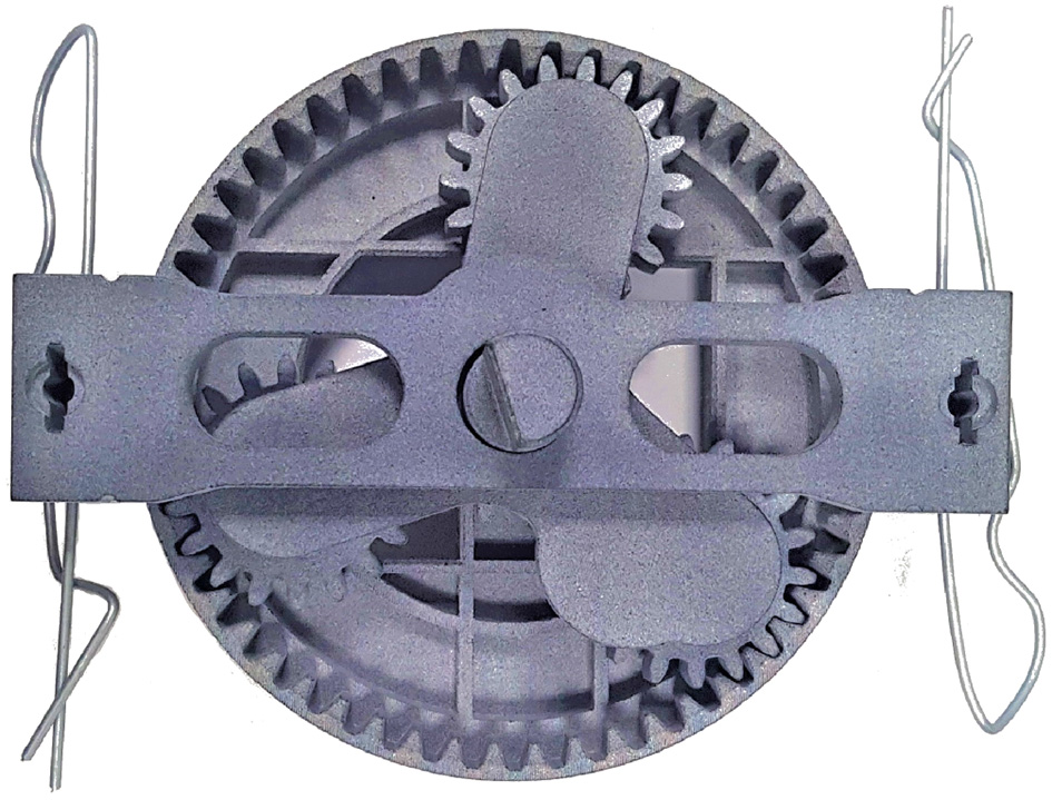 A picture of the finished product. The gearbox is made up of all the components depicted on the right side of Figure 1 plus two clips that keep the assembly together.