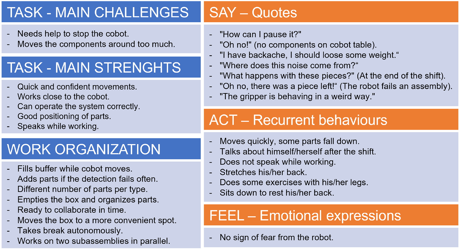 Still today, the diagnosis of autism is based on behavioral markers. Each individual with ASD is likely to have a unique pattern of behavior (in some cases even stereotypical) which tends to be stable over time, still showing common signs that (from low to high functioning) lead to the formulation of a common diagnosis. Considering these premises on the importance of behavior, for the ASD group, we decided to collect additional data in the form of unstructured note-taking to make sure that the loss of specific behavioral occurrences is minimized. Therefore, during the 1-week experiment, two researchers performed a field observation, taking unstructured notes about the human-cobot interaction happening in the lab setting. Specifically, out of 5 days, three work shifts (lasting 3.5 h each) were observed: usually on Mondays, Wednesdays, and Fridays. The logic behind this choice was to picture the beginning, the middle, and the end of the week to see if any substantial change occurred over time. For the entire shift, the researchers (sitting at a desk from a distance and observing the participants non-intrusively), typed down on a computer what was going on while seeking to avoid influencing events occurrence. Unstructured notes were collected without any a priori grid, thus offering the possibility to catch any additional information that was not previously planned and that might happen outside the recording sessions. According to the deductive thematic analysis, the researcher, driven by specific interests, explores the dataset to code the information according to a preexisting theoretical framework or preconceptions (Nowell et al., 2017; Kampira and Meyer, 2021). Operationally, the researcher collected all the text files, grouping each by participant and specifying whether the notes were taken during the first, second, or third day. Then, by adapting the empathy map (a tool used in UX design to succinctly characterize each user Nielsen Norman Group, 2018), a qualitative profile of each ASD participant in the research was drawn up. Informative cards, named “Personas,” (see the example provided in Figure 3) were compiled, summarizing the profile of each ASD participant in five categories: “Task” (divided into “main challenges” and “main strengths”), “Work organization,” “Say—quotes,” “Act—Recurrent behaviors” and “Feel— Emotional expressions (if any).” By the “Task” category, we mean the main challenges and strengths that occurred between the cobot and the operator during each phase of the assembly task (e.g., s/he is able to manage the cobot stops, s/he is aware of the pedals usage, s/he is concentrated on the task, etc.). By “Work organization” we intend for example the strategies used by the operator to fill the tables with the corresponding pieces or the ability to manage some operations simultaneously. The last three categories “Say—quotes,” “Act—Recurrent behaviors” and “Feel—Emotional expressions (if any)” refer to what participants verbalized during the assembly task, the recurrent actions (not strictly related to the assembly task, e.g., checking the phone, crossing the arms, snapping the fingers) and eventually any kind of emotional expression (e.g., smiling, singing, etc.). It is important to note that the two researchers responsible for this tool were different from those who filled the observational grids described above. Also, it is important to reiterate that since the information was collected without the observer systematically searching for a specific behavior (as was done through the Observational Grid), it was not possible to perform a frequency quantification but only a qualitative description of the emerged behaviors. In this paper, we addressed the research need to outline the behavioral peculiarities of ASD participants; hence, unstructured notes were collected 3.5 h a day for the duration of three work shifts. The unstructured notes were collected only on the ASD group, as the researchers aimed to describe as much as possible the novelty of neurodiverse participants interacting with collaborative robots: being ASD a condition manifesting in behavioral patterns, the researchers wanted to picture any peculiarity or unexpected work-method during the experiment. This kind of information could not be collected through the predefined grid, as the duration of the videos was limited (compared to the 3.5 h per three days observations in the lab setting) and the observable events were defined a priori. Therefore, the decision to use PERSONAS only for ASD participants supported our aim to use an exploratory and qualitative approach to view the data more extensively, rather than to make a comparison between groups.