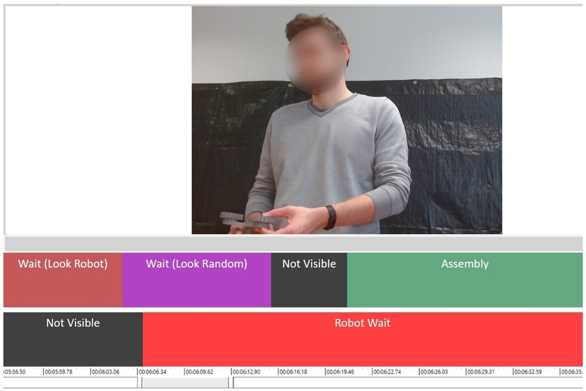 An illustration of session annotation for a participant. The image shows a video frame of the participant waiting for the robot. The top track has the labels for the participant and the one below has labels for the robot.