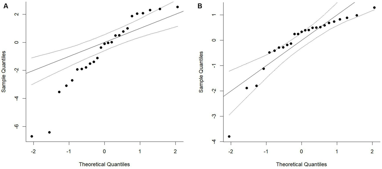 QQ plot of the distribution of standardised mean differences within the primary studies. Chart A shows the fixed effects model and Chart B depicts the random effect model using the restricted maximum-likelihood estimator.