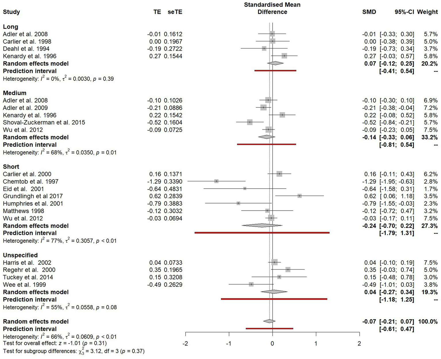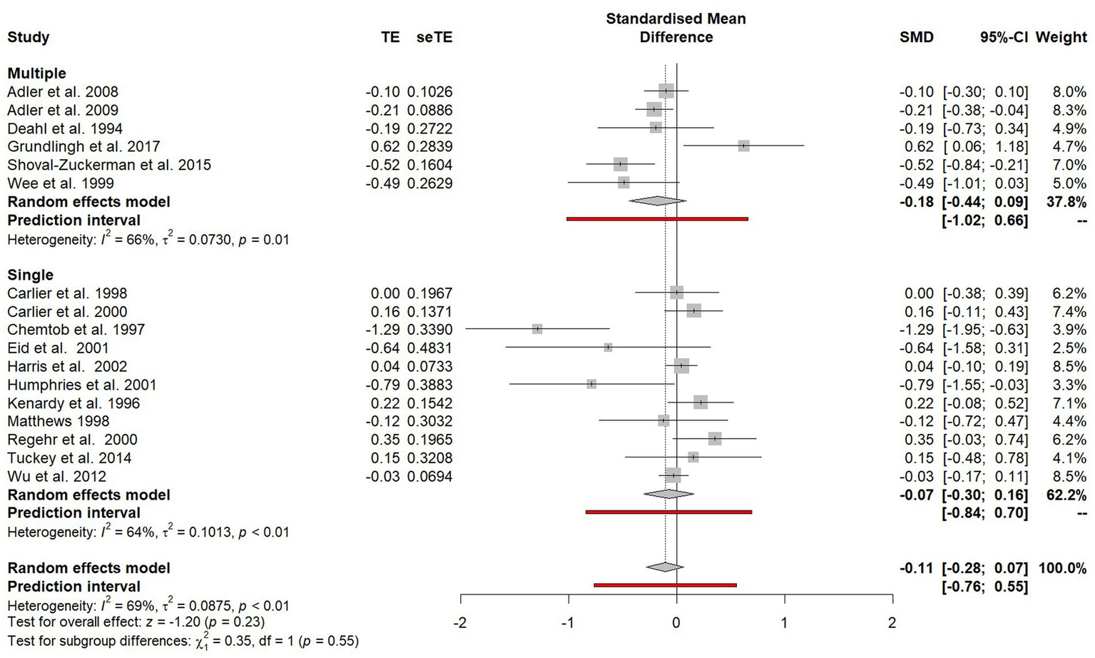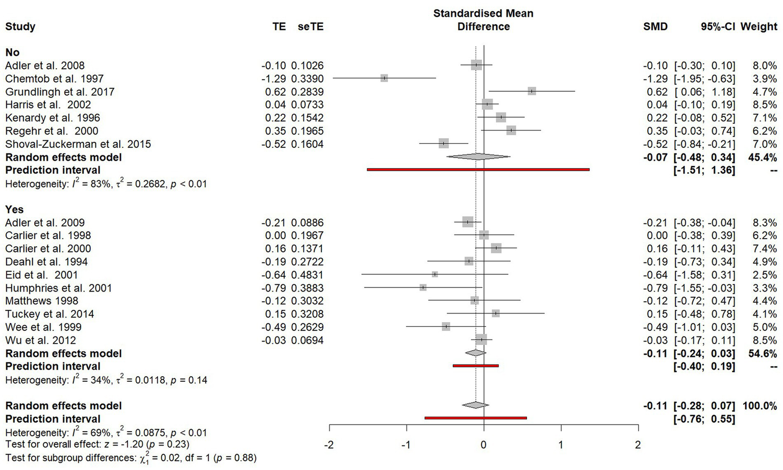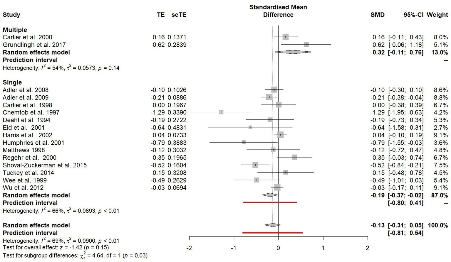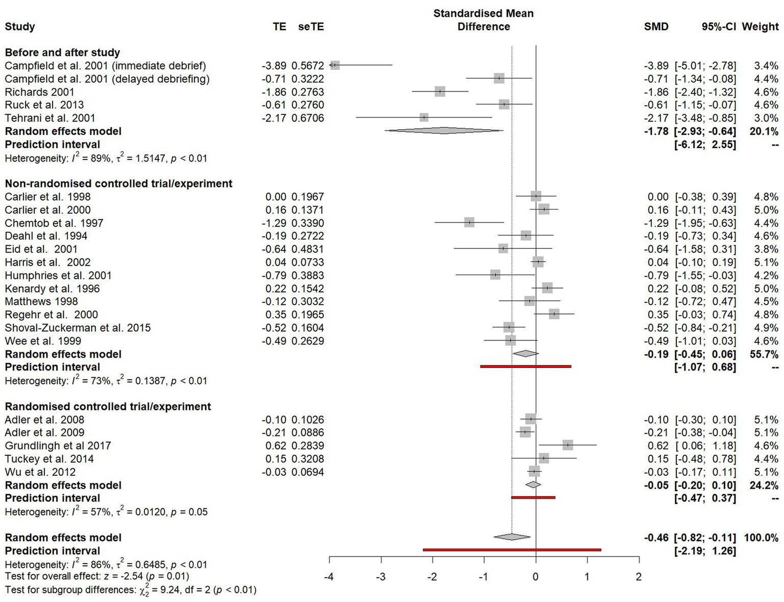 Due to insufficient studies within the Cochrane review of psychological debriefing (Rose et al., 2002), formal subgroup analysis was not undertaken to explore potential sources of heterogeneity in outcomes. Through including a wider range of study designs, this study sought to utilise subgroup analyses to identify key components that may determine the effectiveness of psychological debriefing, including those proposed by Hawker and Hawker (2015) and Richins et al. (2020) such fidelity to an established model, the length of debriefs and the extent of the debriefers training.