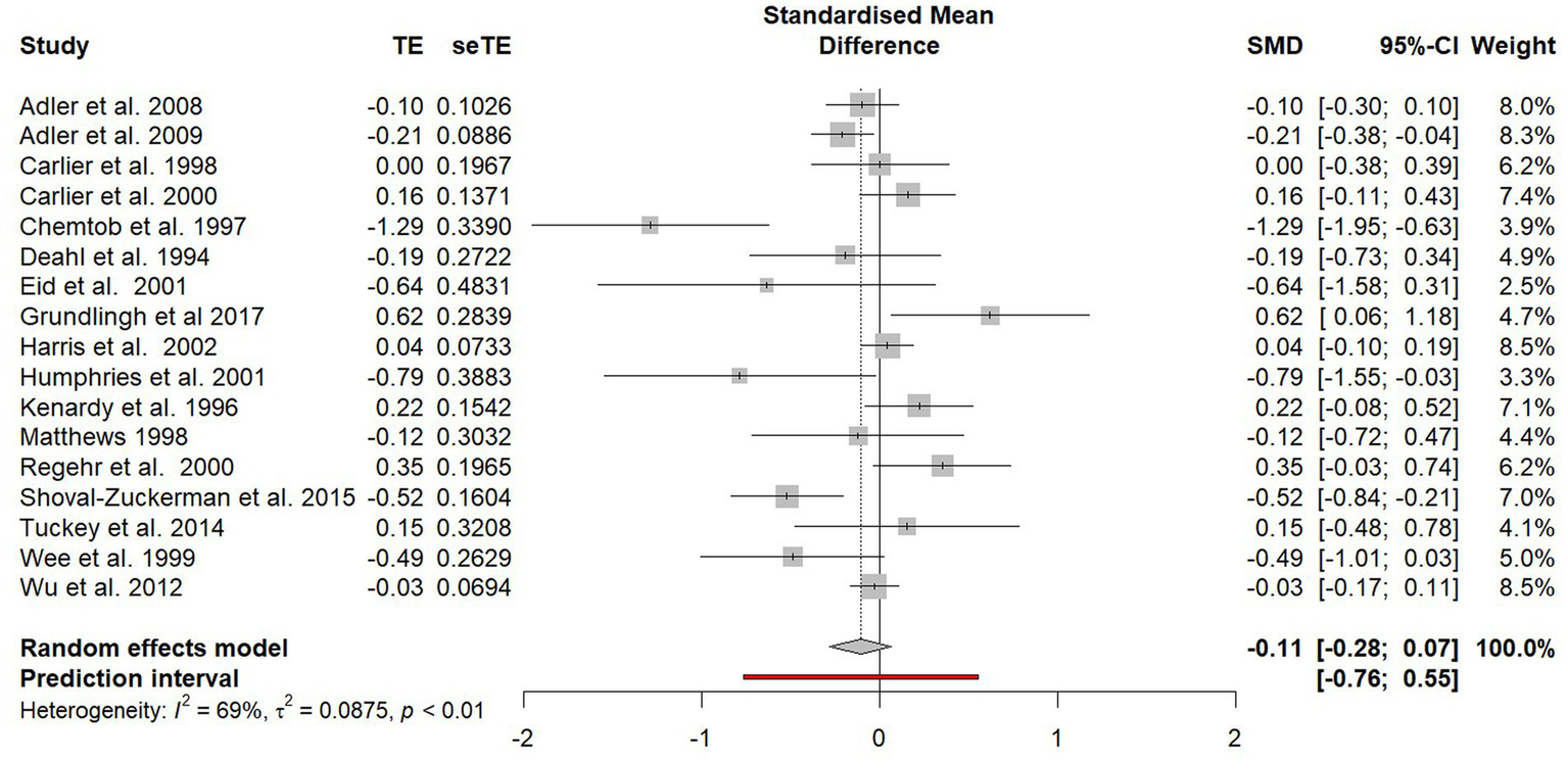 Two studies (Campfield and Hills, 2001; Richards, 2001) included a comparator group rather than a control group, in which participants also received a form of psychological debriefing. In the study by Campfield and Hills (2001), participants either received an “immediate” (<10 h) or “delayed” (>48 h) debriefing. Data for both groups was extracted but treated separately as two before-and-after studies. In the study by Richards (2001), one group received CISD, and the other group received the more extensive package of critical incident stress management. Again, this study was treated as a before-and-after study and only data from the CISD group was extracted. One between-group study (Ruck et al., 2013) reported significantly different baselines scores of PTSD symptoms between the experimental group and control group. As this was not controlled for in the statistical analysis (e.g., by using a treatment x timepoint ANCOVA), this study was also treated as a before-and-after study and only the data from the experimental group was extracted.