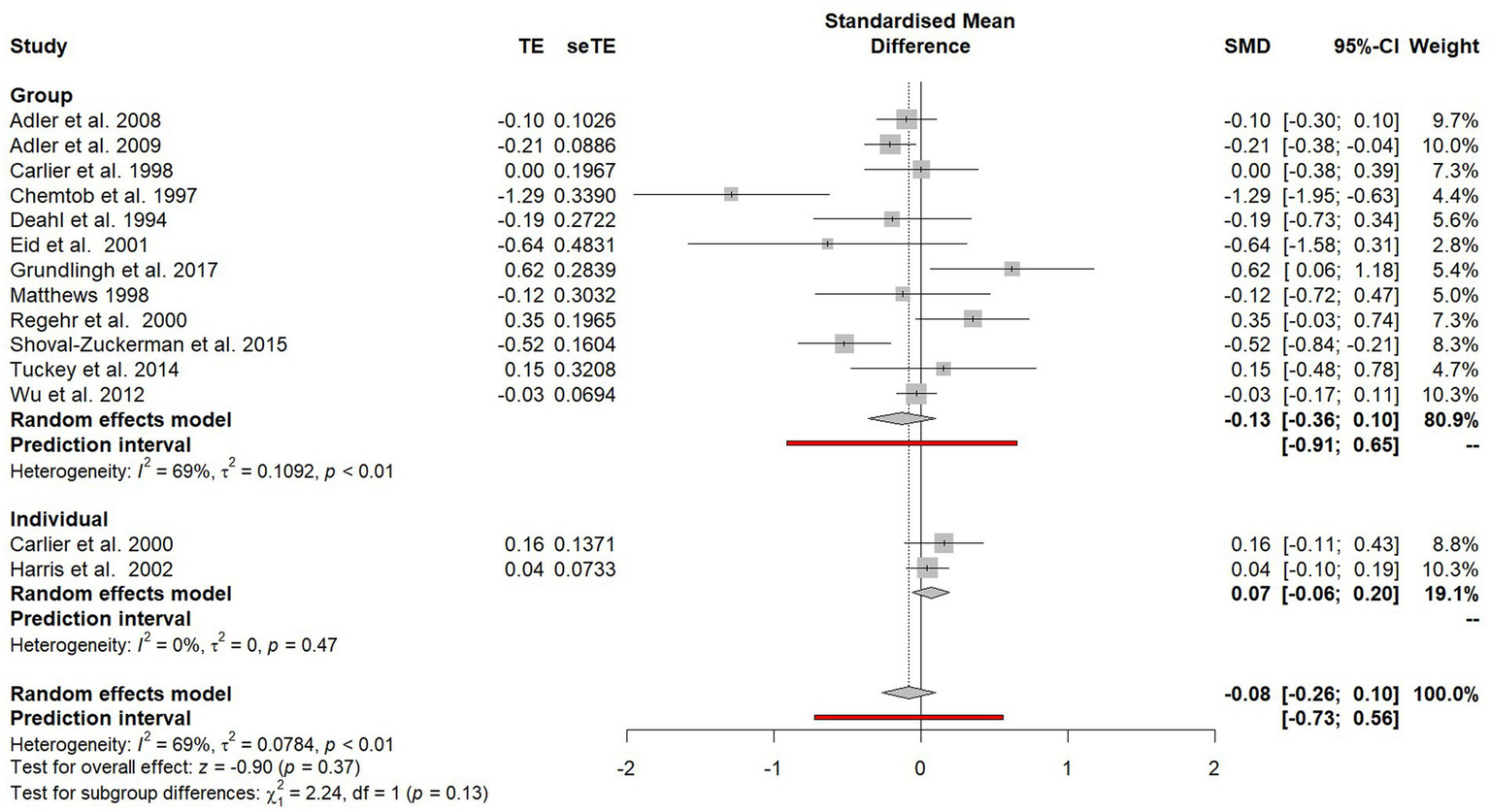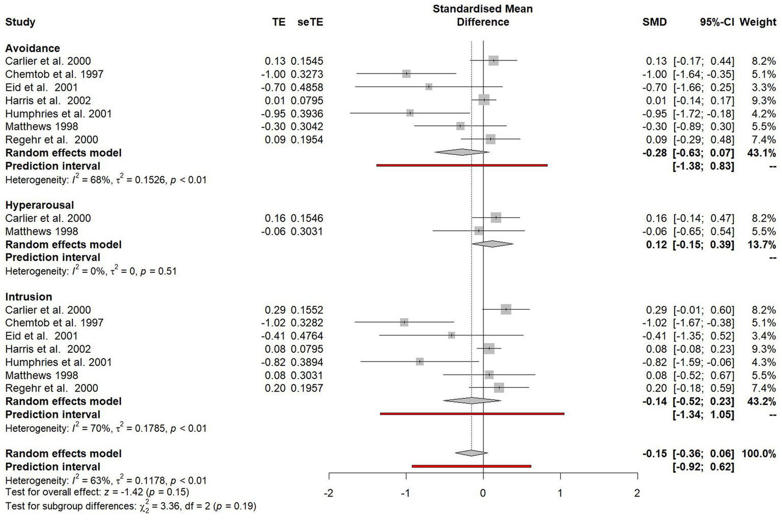 Some studies reported PTSD symptom cluster subscale scores on outcome measures (avoidance, hyperarousal, intrusion), while other studies only reported overall scores. Three studies (Carlier et al., 2000; Tehrani et al., 2001; Harris et al., 2002) only reported cluster subscale scores. However, as these subscales included all the items on the PTSD measures used, the total mean score could be calculated and ultimately transformed into an estimate of Cohen’s d.