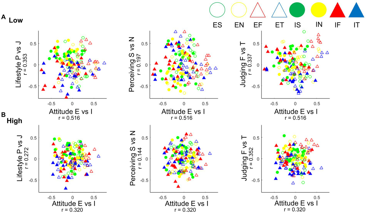 Results of MDS based on the correlation between design matrix (Table 1) and MDS solution coordinates after Procrustes rotation for lower and higher psychological distress clusters. (A) The Pearson correlation of rotation and the design matrix for the lower psychological distress population resulted in 0.516 for attitude (E vs. I), 0.353 for lifestyle (P vs. J), 0.197 for perceiving (S vs. N), and 0.337 for judging (F vs. T). (B) For the higher psychological distress population, the Pearson correlation of rotation and the design matrix were 0.32 for attitude (E vs. I), 0.272 for lifestyle (P vs. J), 0.144 for perceiving (S vs. N), and 0.352 for judging (F vs. T). E, extroverted; I, introverted; P, perceiving; J, judging; S, sensing; N, intuition; F, feeling; T, thinking.