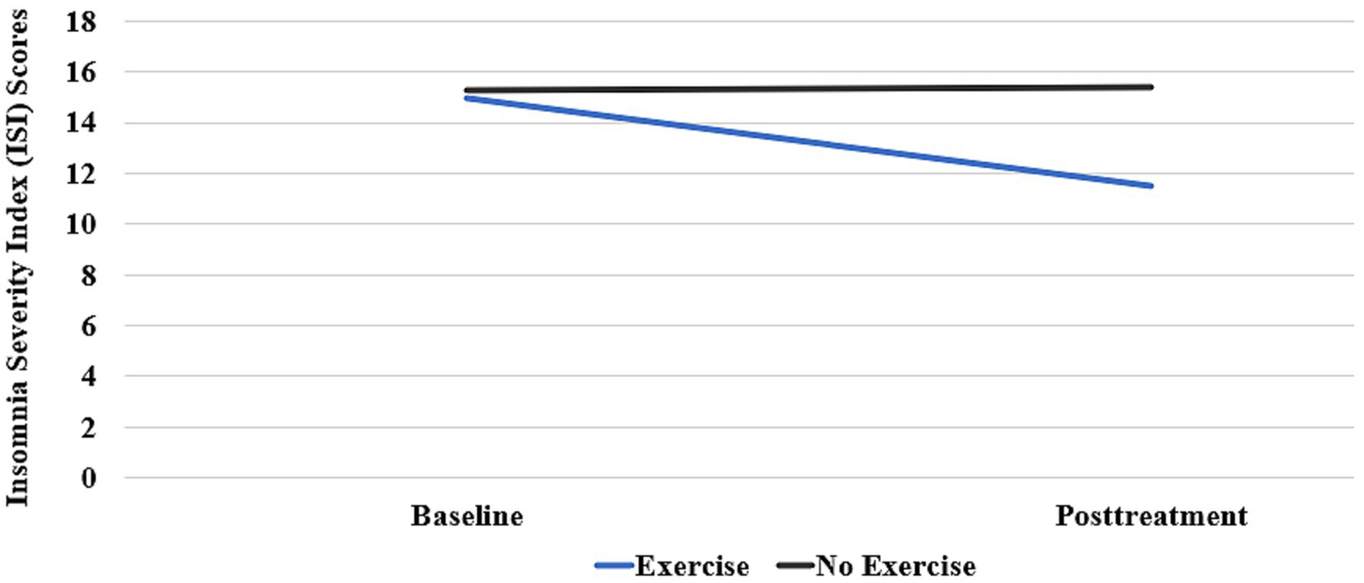 Based on this research, an analysis of data previously collected as part of an experimental study was undertaken to further investigate the relationships among aerobic exercise, sleep, and posttraumatic stress symptoms in active duty service members. The original study was designed to determine if the efficacy of the imaginal exposure component of PE for symptoms of PTSD could be improved by adding aerobic exercise (Young-McCaughan et al., 2022). PTSD symptom severity decreased an average of 11.4 points on the PTSD Checklist – Stressor-Specific (PCL-S) following treatment (p < 0.0001); however, there were no significant differences between the experimental conditions. The parent study found the Cohen’s d effect size for exercise alone to be 0.73, larger than others have found (Rosenbaum et al., 2015b; Whitworth and Ciccolo, 2016; Oppizzi and Umberger, 2018; Hegberg et al., 2019; Björkman and Ekblom, 2022). Based on data suggesting that exercise improves sleep, the objective of this paper was to examine if physical exercise reduced insomnia in this sample and whether any change in insomnia predicted change in PTSD symptoms. Three research questions were posed: (1) Did randomization to an aerobic exercise intervention reduce insomnia more than being randomized to an intervention without aerobic exercise, (2) Did change in insomnia predict change in PTSD symptoms, and (3) Did change in insomnia impact the relationship between exercise and PTSD symptom reductions?