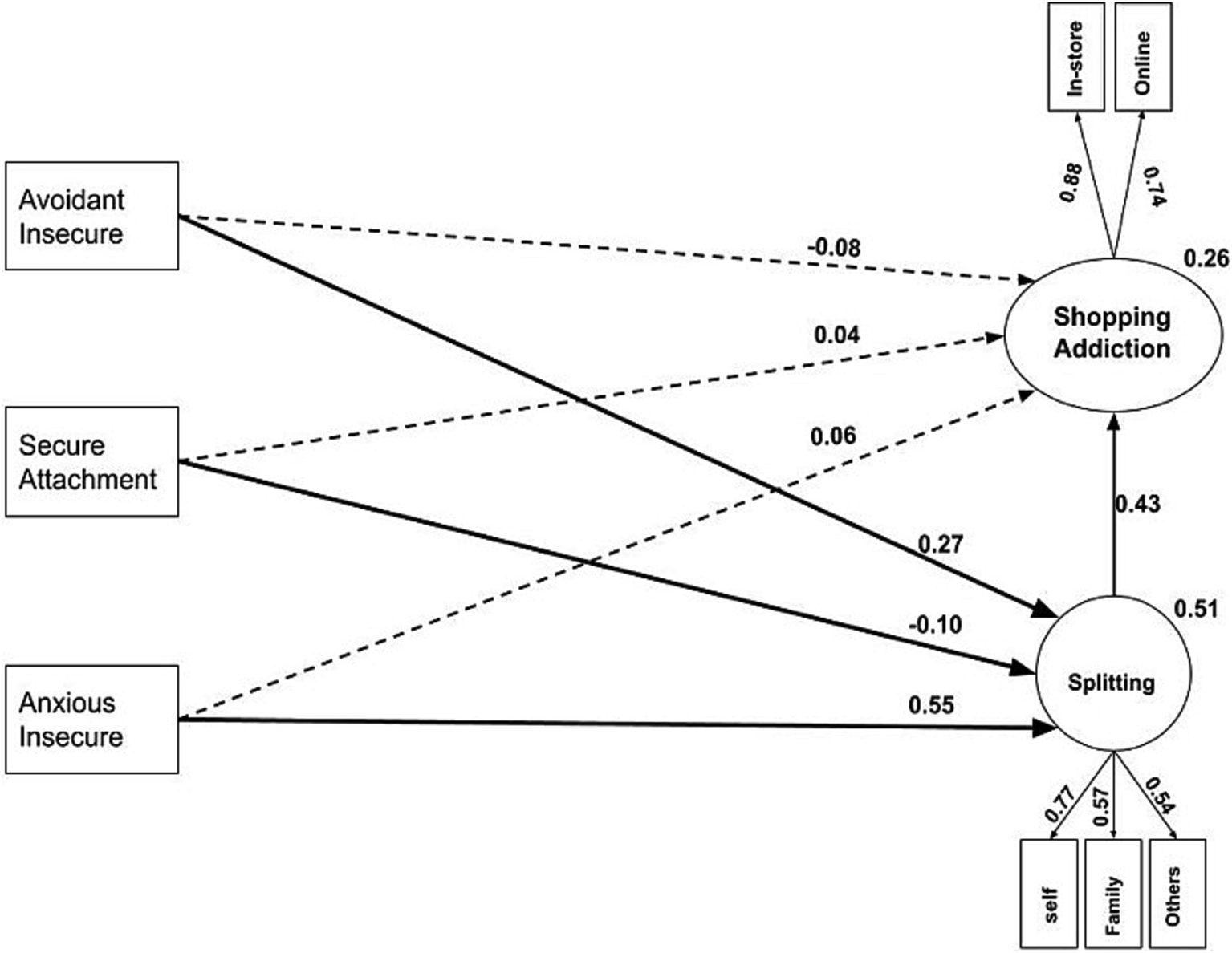 The normality and non-collinearity assumptions were verified prior to analyzing the data. To confirm the normality assumption for all variables, descriptive statistical analysis such as skewness and kurtosis indices were employed. The outcomes of this analysis are presented below: anxious attachment style (Ku = −0.456, Sk = −0.069), avoidant attachment style (Ku = −0.388, Sk = −0.128), secure attachment style (Ku = 0.087, Sk = −0.312), splitting from self-image (Ku = −0.569, Sk = −0.0124), splitting from family-image (Ku = −0.737, Sk = 0.463), splitting from others-image (Ku = − 0.154, Sk = − 0.356), online shopping addiction (Ku = − 0.086, Sk = 0.700) and in-store shopping addiction (Ku = − 0.332, Sk = 0.742). Chu and Bentler (1995) suggest that a skewness value of ±3 is a suitable cutoff point. In multivariate research, values above ±10 for the kurtosis index are usually problematic (Kline, 2015). The skewness and kurtosis values obtained for all variables indicate that the normality assumption is met. Table 1 presents the central tendency, dispersion indices, and correlation of research variables.