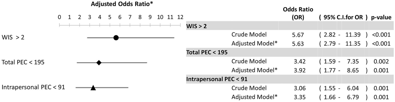 Relative to the group without depression, the group with depression had a higher total WIS score (3.3 ± 1.2 vs. 2.1 ± 1.4; p < 0.001), a lower total PEC score (173 ± 28 vs. 186 ± 31; p = 0.005), and a lower intrapersonal PEC score (84 ± 19 vs. 96 ± 20; p < 0.001). However, these two groups had no significant differences in total interpersonal PEC score or TECA score.