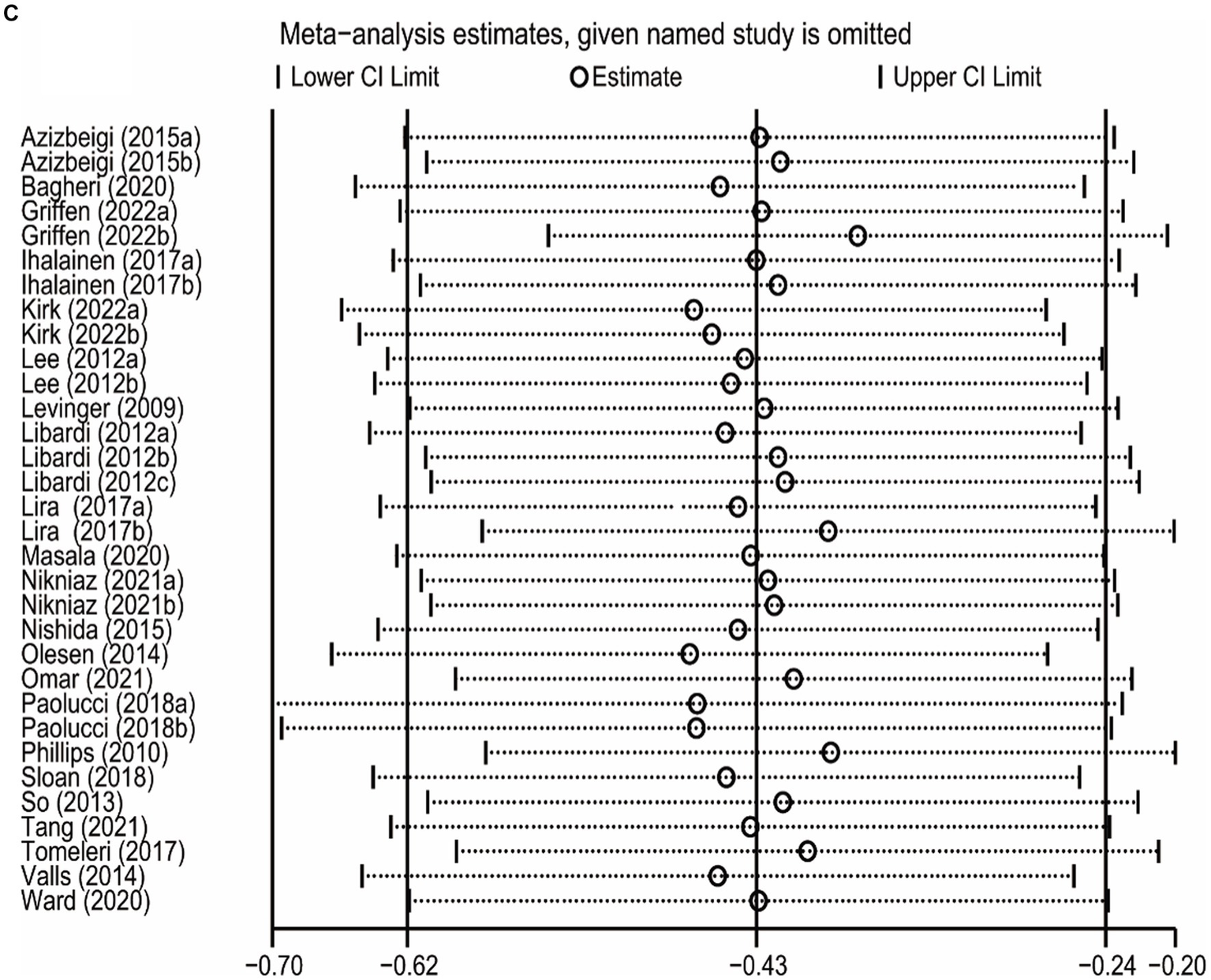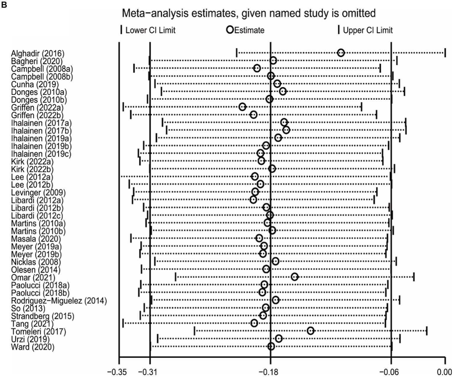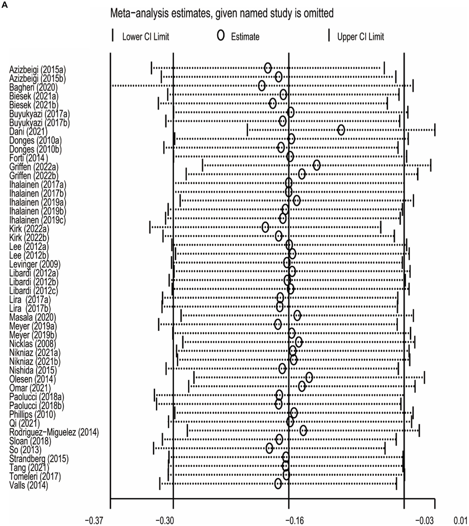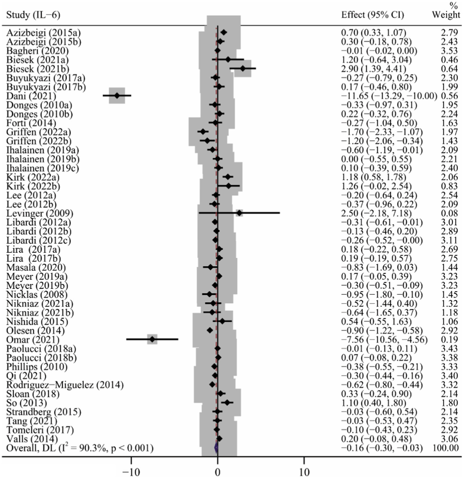 As shown in Table 2, assessments for IL-6 levels were reported in 32 articles (Nicklas et al., 2008; Levinger et al., 2009; Donges et al., 2010; Phillips et al., 2010; Lee et al., 2012; Libardi et al., 2012; So et al., 2013; Beltran Valls et al., 2014; Forti et al., 2014; Olesen et al., 2014; Rodriguez-Miguelez et al., 2014; Azizbeigi et al., 2015; Nishida et al., 2015; Strandberg et al., 2015; Buyukyazi et al., 2017; Lira et al., 2017; Ihalainen et al., 2018; Paolucci et al., 2018; Sloan et al., 2018; Tomeleri et al., 2018; Ihalainen et al., 2019; Meyer et al., 2019; Bagheri et al., 2020; Masala et al., 2020; Biesek et al., 2021; Dani et al., 2021; Kirk et al., 2021; Nikniaz et al., 2021; Omar et al., 2021; Qi et al., 2021; Tang et al., 2021; Griffen et al., 2022) involving 48 interventions. Results of the meta-analysis showed that long-term ET caused a significant decrease in IL-6 levels (SMD −0.16, 95% CI −0.30 to −0.03), although high heterogeneity was observed among the studies (p < 0.001, I2 = 90.3%) (Table 2 and Figure 2). Subgroup analysis showed that studies of baseline BMI > 25, female subjects, duration of exercise less than 12 weeks, frequency of less than three times a week, and type of multicomponent exercise were associated with PE-induced reduction in IL-6 levels (Table 2). The result of the Begg’s test (p = 0.917), Egger’s test (p = 0.091) and funnel plot (Supplementary Figure S1) indicated no significant publication bias in the primary analysis for IL-6 (Table 2).
