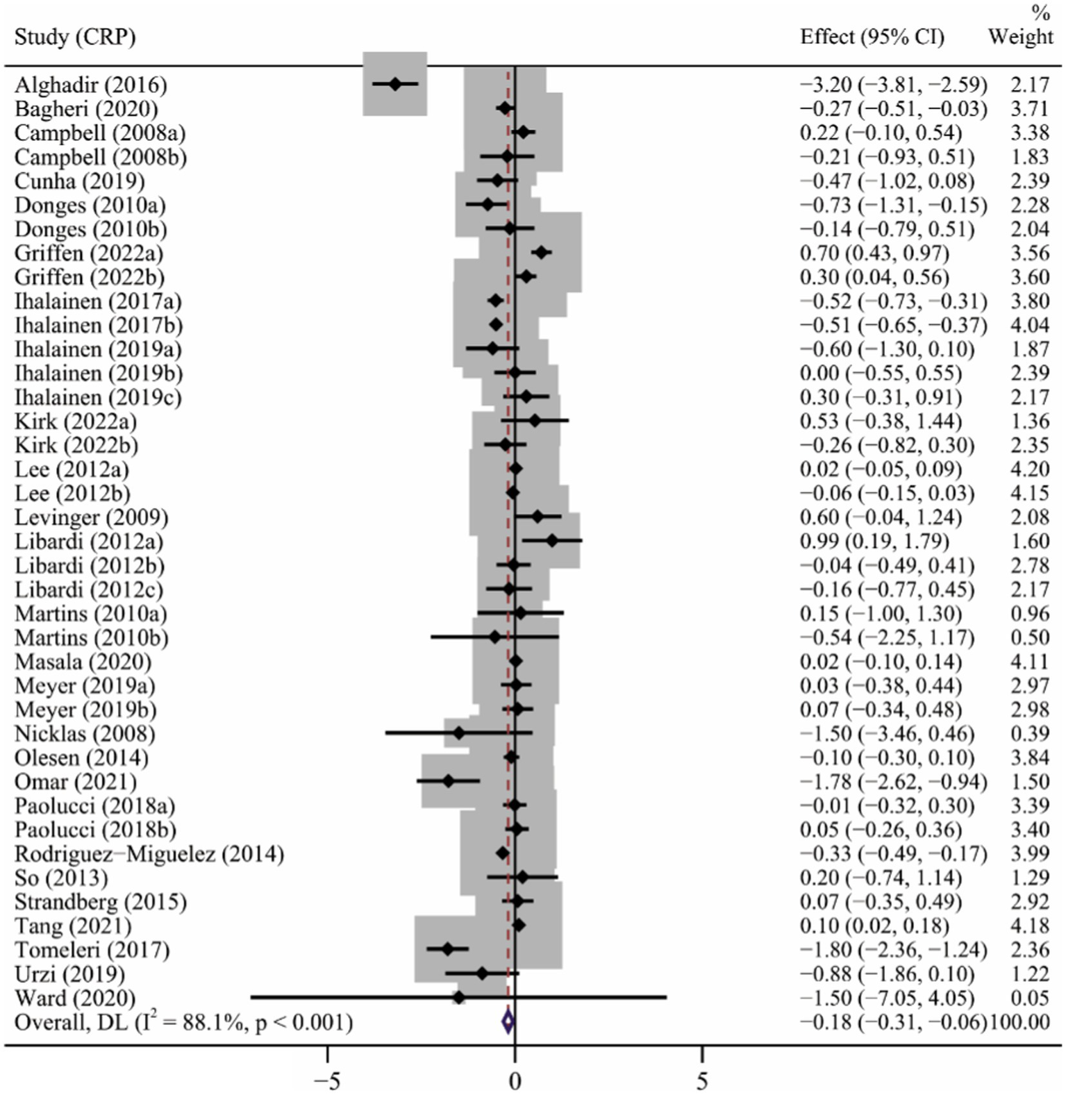 This meta-analysis investigated the effect of long-term exercise training (ET) including aerobic, resistance, and multicomponent ET on the levels of inflammatory biomarkers in randomized controlled trials (RCTs) involving healthy subjects.