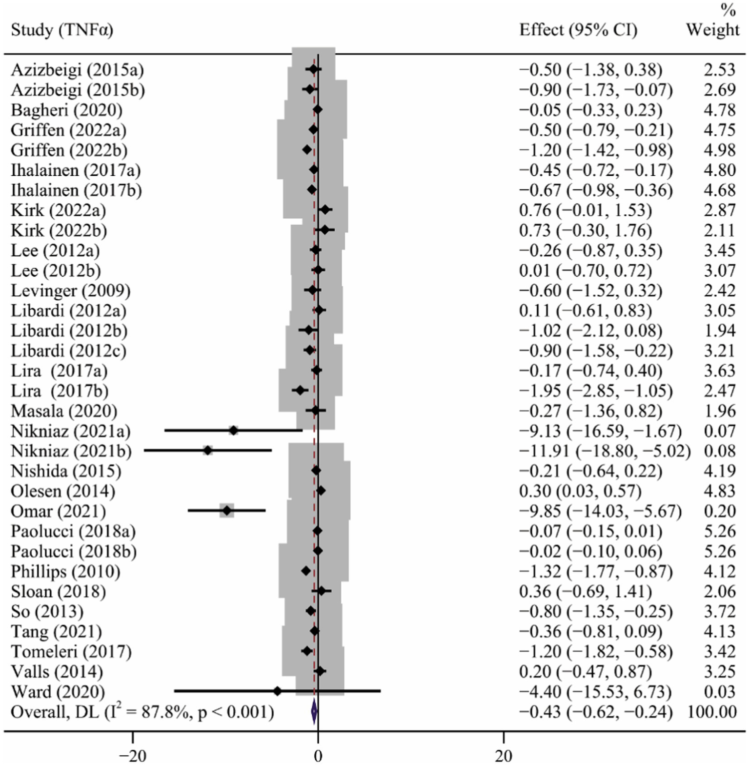 The quality of the methodology of three studies (Olesen et al., 2014; Dani et al., 2021; Griffen et al., 2022) was rated as excellent according to the PEDro scale (scores ≥9), while the remaining 35 studies were rated as good quality (6–8 scores) mainly due to lack of blinding (Table 1). According to the GRADE system, the quality of evidence for IL-6, CRP were moderate, and TNFα was low (Supplementary Table S2).
