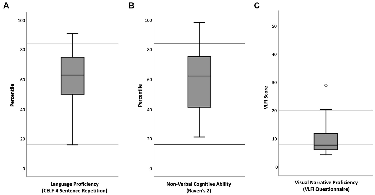 Boxplots of participants’ scores on standardized verbal and non-verbal behavioral tests. Horizontal lines in (A) and (B) mark the 16th percentile and the 84th percentile, which are the thresholds for below and above average scores. Horizontal lines in (C) mark 8 VLFI scores and 20 VLFI scores, which are thresholds for low and high scores in adults (VLFI is not standardized for children). The maximum possible VLFI score is 52.5.
