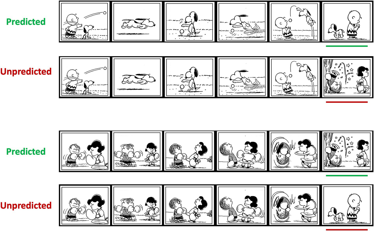Examples of picture stimuli. Each comic strip consisted of six panels that conveyed a visual narrative. Panels were presented one at a time. Green lines mark predictable critical panels and red lines mark unpredictable critical panels (for visualization here only). Images are copyright Peanuts Worldwide. Reproduced with permission.