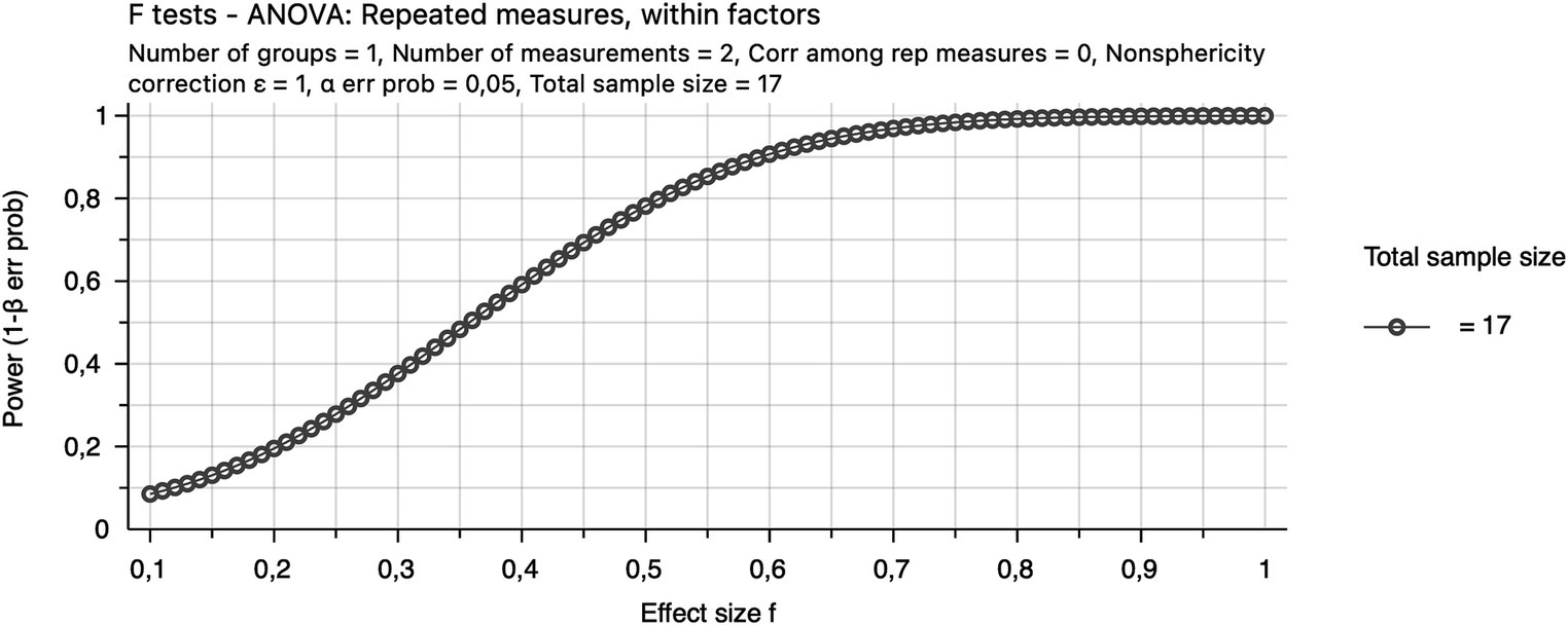 Pre-study power calculations were not performed, but the sample size is comparable to the mean sample size (18.5 participants) in recent N400 studies reviewed by Šoškić et al. (2022). In addition, we provide a sensitivity power plot (created in G*Power: Faul et al., 2007). A sensitivity power plot facilitates the interpretation of results when pre-study power calculations have not been performed (Lakens, 2022). The sensitivity power plot below (Figure 5) shows that a within-subjects ANOVA with two measurements and 17 participants has reasonable power for the detection of differences with large effect sizes (e.g., 0.8 for f = 0.5).