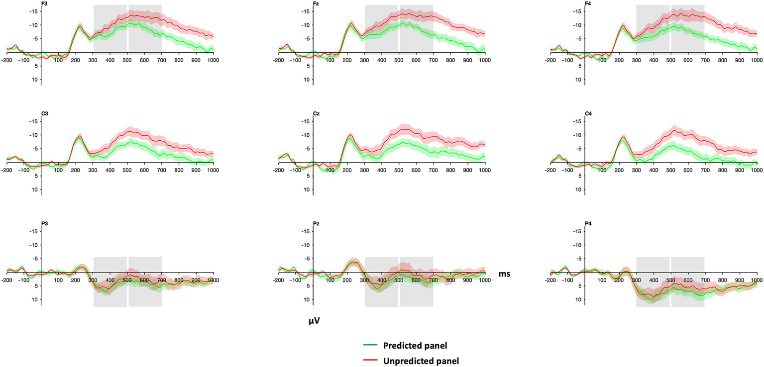 Grand average waveforms of ERPs for predicted and unpredicted panels within visual narratives. Panel onsets of critical panels are at zero ms. Grey boxes indicate the time windows and electrodes that were used in the statistical analyses (see 3.3 below). Red and green shadings indicate ±1 SE. Negative is plotted up.