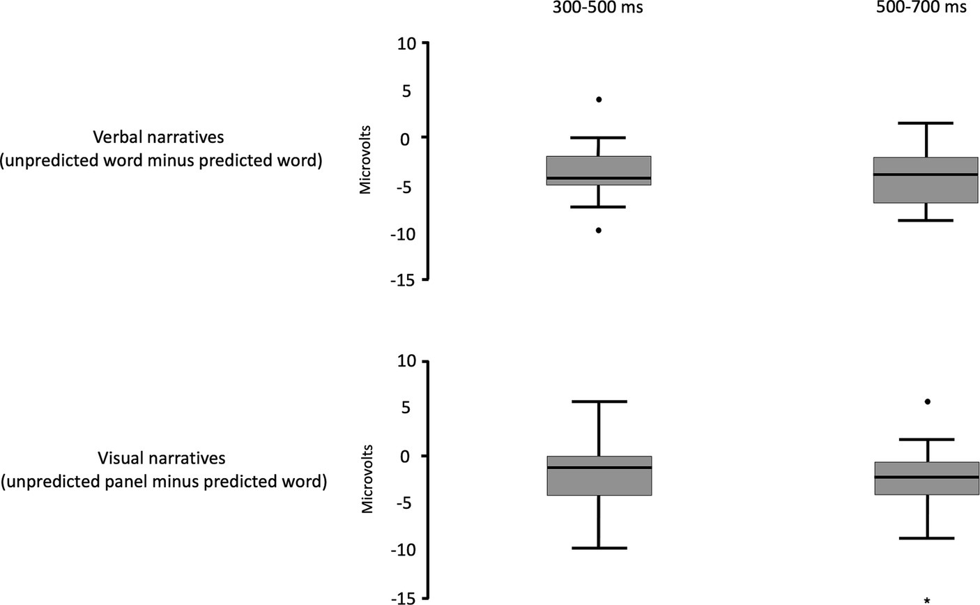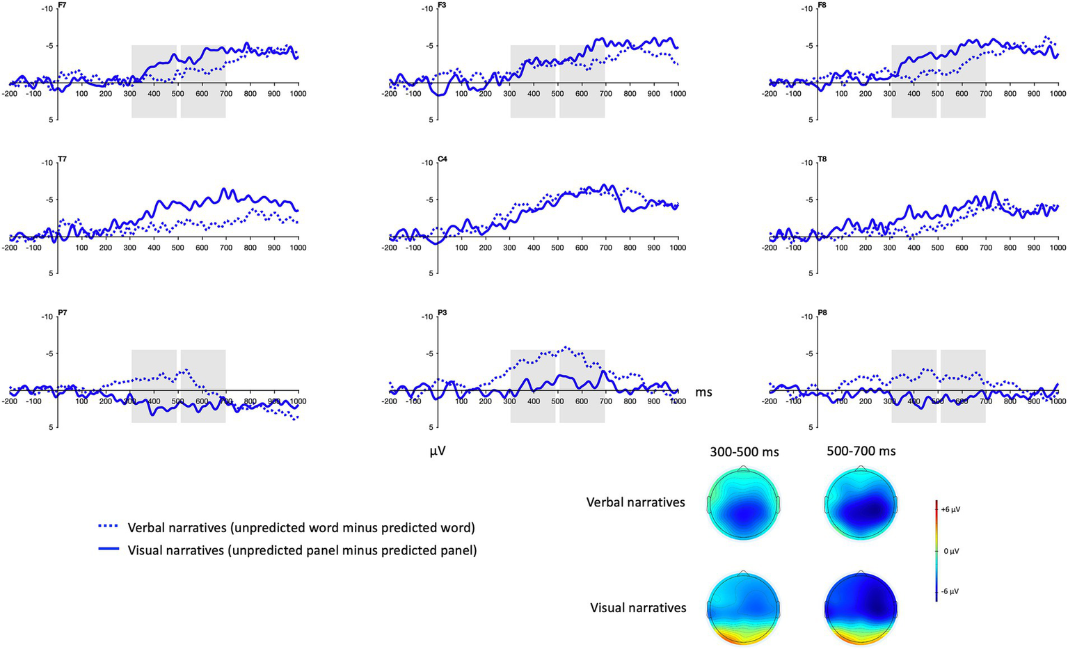 Similar to the results for verbal narratives, panels elicited a more negative ERP response when unpredicted from the context than when predicted in the 300–500 ms and 500–700 ms time window (Figure 7).